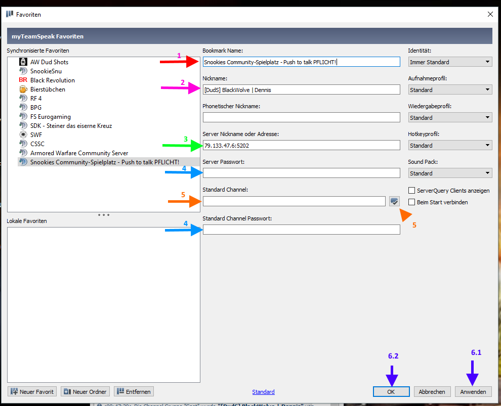 Den Bookmarkname könnt ihr so ändern, wie es euch beliebt, wie ihr links im Bild seht, habe ich den Server oben im Bereich Synchronisierte Favoriten einfach SnookieSnu genannt, ich weiß somit, dass wenn ich später darauf klicke mit Snu's TS Server verbunden werde.