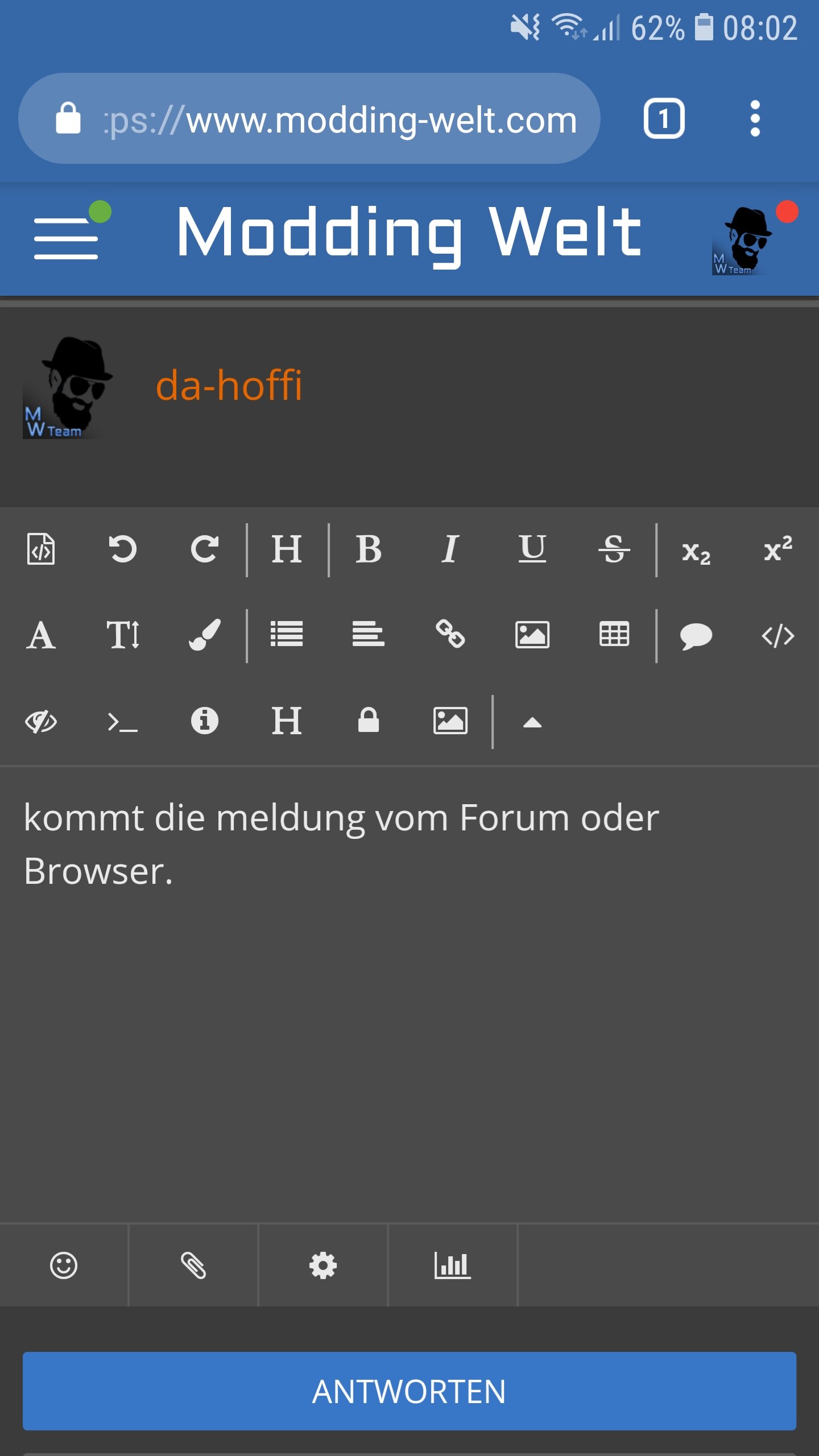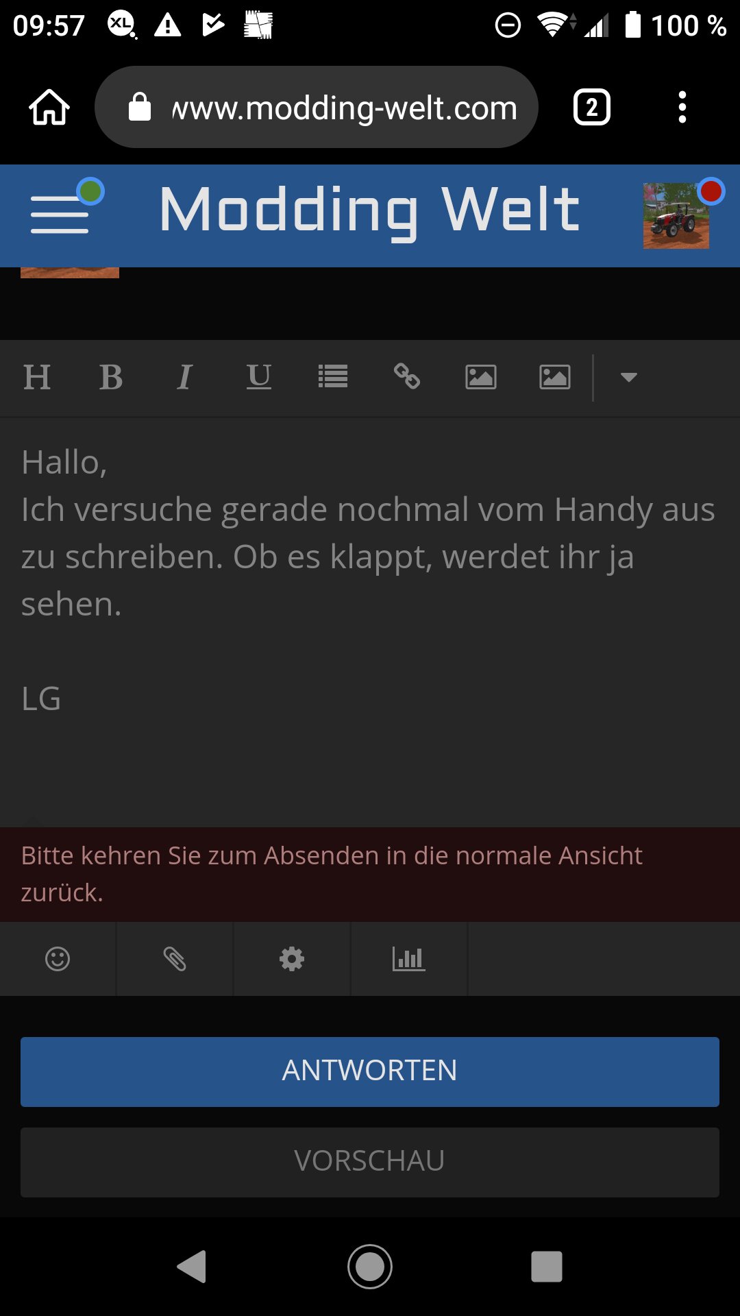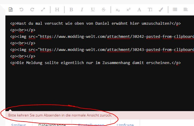 Seit neuem habe ich ein total merkwürdiges Problem mit dem Forum hier. Und zwar kriege ich wenn ich einen Beitrag per Handy veröffentlichen will immer die Fehlermeldung: ,, Um einen Beitrag veröffentlichen zu können, kehren Sie bitte zur normalen Ansicht zurück. "
