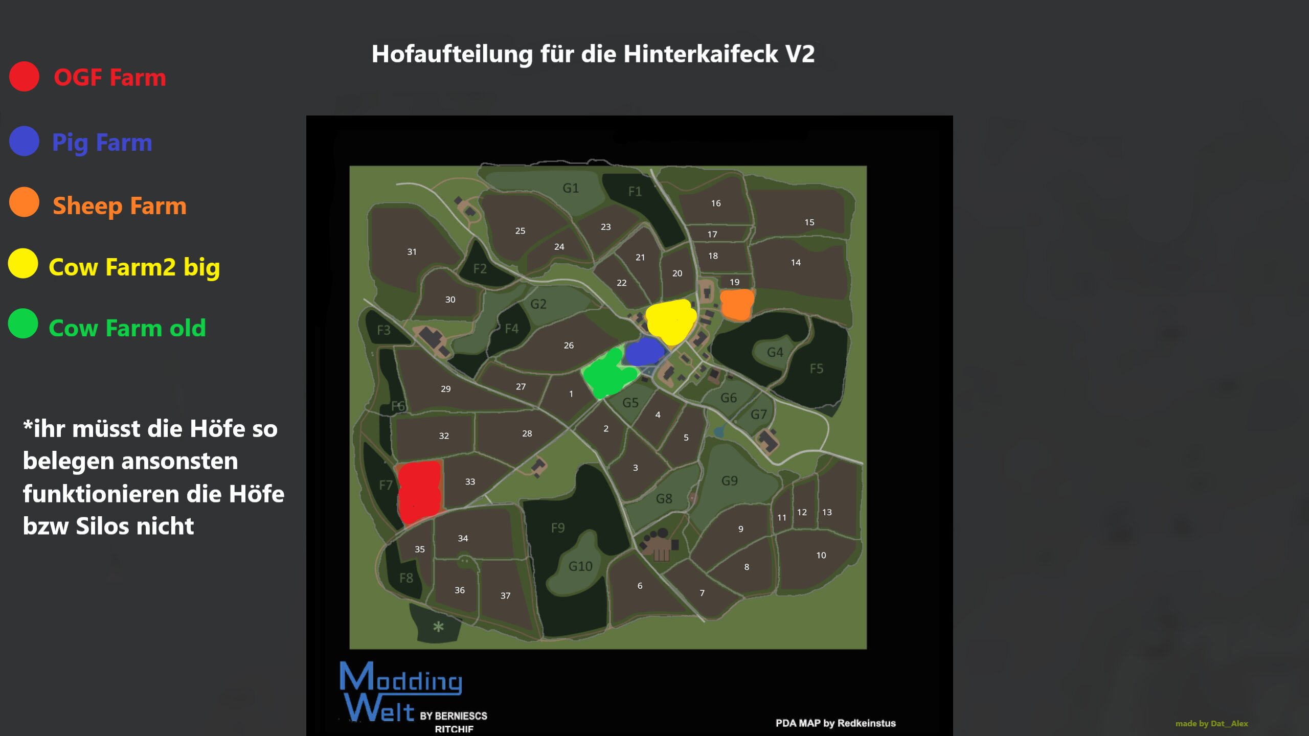 da mich ein paar Leute angesprochen haben das sie im MP probleme mit den Höfen haben (Silos funktionieren nicht etc) und es scheinbar für einige nicht ersichtlich ist welcher Hof welches Gelände ist hab ich mal was fertig gemacht. Weiterhin viel Spaß beim zocken