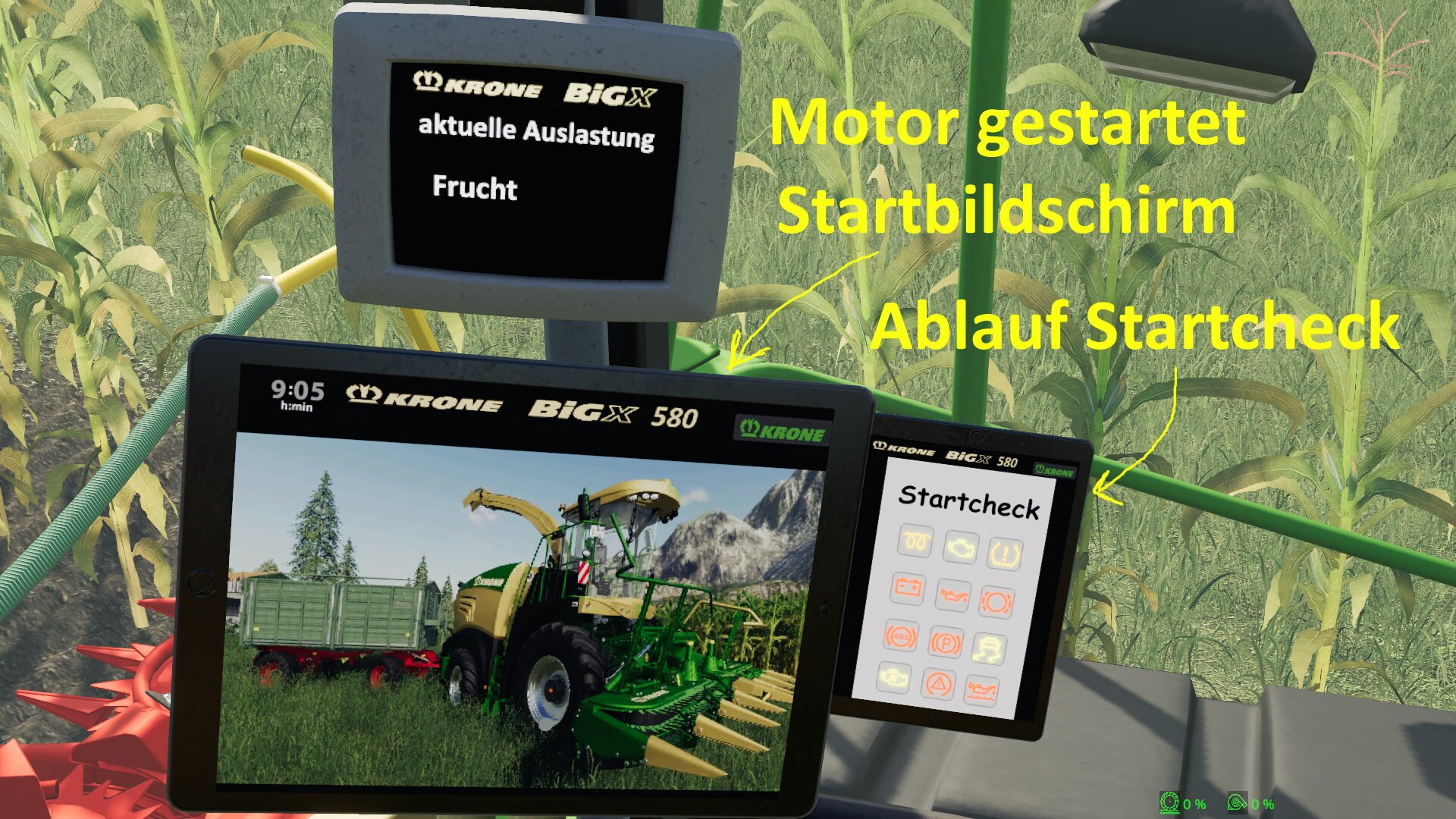 Am Big X wurden verschiedene Farbwahlen hinzugefügt sowie verschiedene Konfigmöglichkeiten, es ist nun auch ein Bandlaufwerk auswählbar, sowie kann ausgewählt werden ob man eine Reifenregeldruckanlage ( RDA ) nutzen möchte oder nicht bei dieser muss erst der Druck verstellt werden mit STRG + Bild rauf oder Bild runter und dann STRG + P gedrückt werden zum Druck anpassen der Druck wird unten im Hilfefenster ( F1) angezeigt. Desweiteren hat der BIG X Schlauchanschlüsse bekommen für Hydraulik, Strom, und Luft für angekoppelte Anhänger wie auch eine animierte ( beim ankoppeln ) Kupplung für Kugelkopf Anhängungen. Außerdem sind auch Hydraulikanschlüsse für die Anbaugeräte am BIG X wie auch an den Anbaugeräten vorhanden. Ein anderer Hupen Sound ist auch verbaut, und der Häcksler macht nun beim rückwärtsfahren das Wanblinklicht so wie die hinteren Arbeitsscheinwerfer :D.