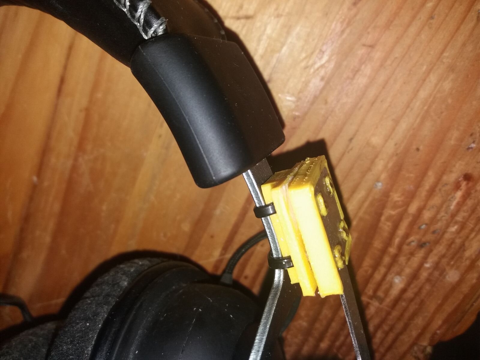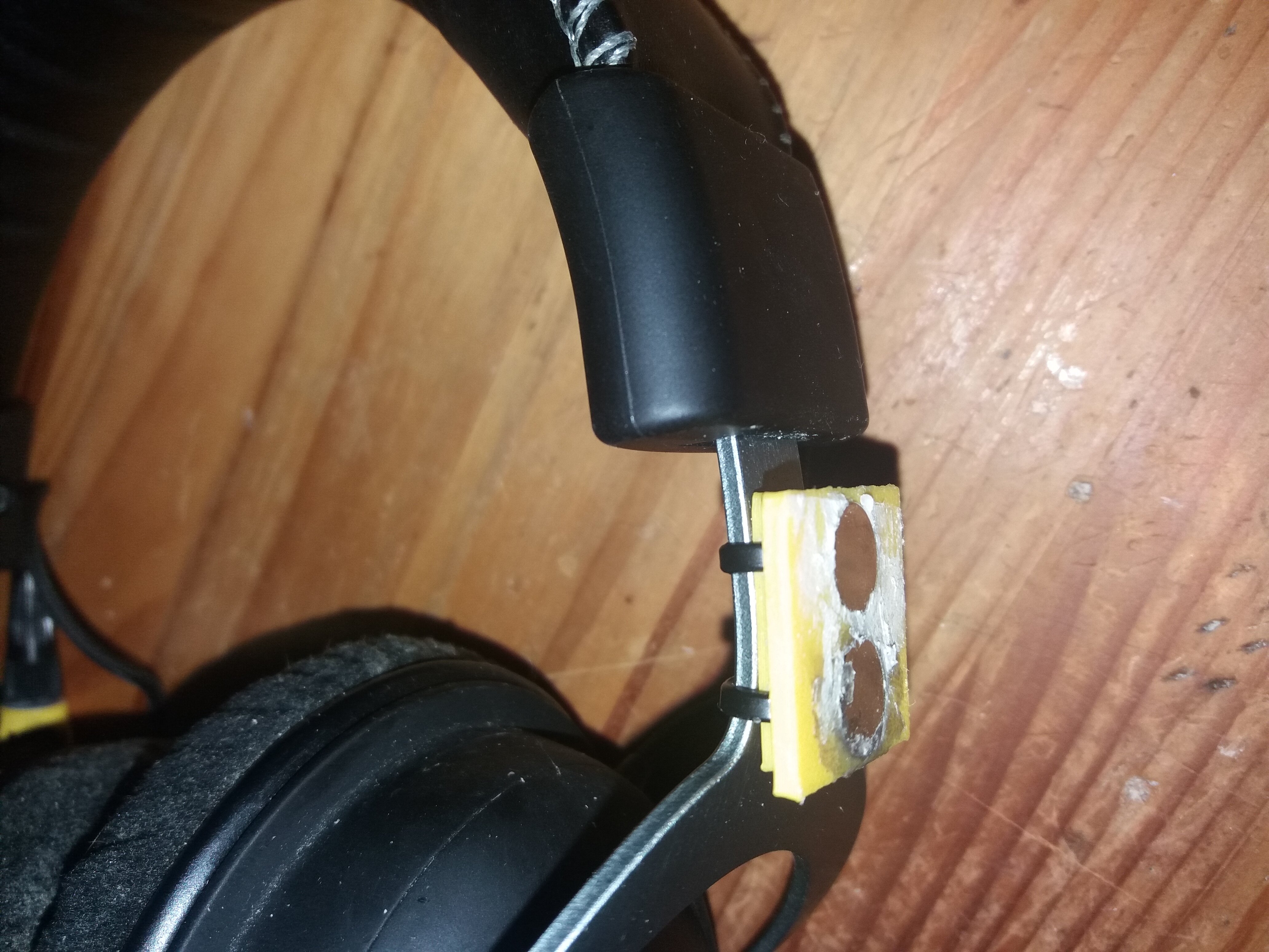 Um den Clip zum Laden abnehmen zu können, habe ich das ganze mit selbstklebendem Klettband an der Außenfläche der Ohrmuschel befestigt.