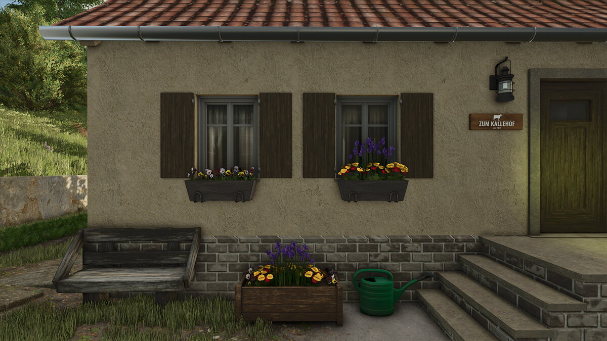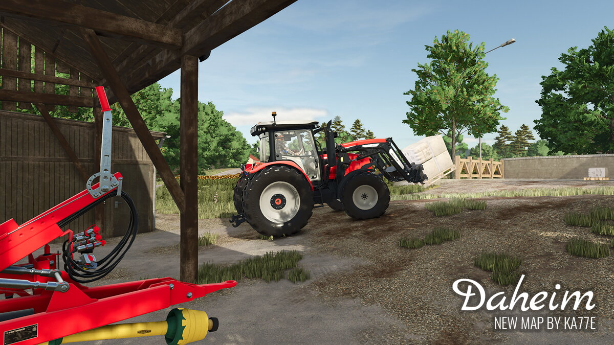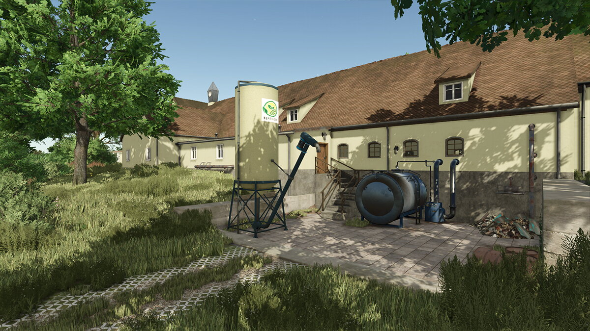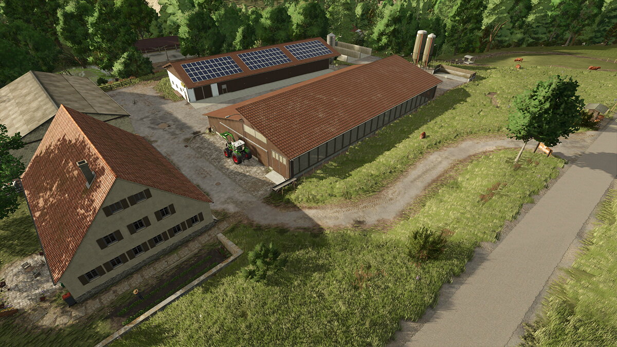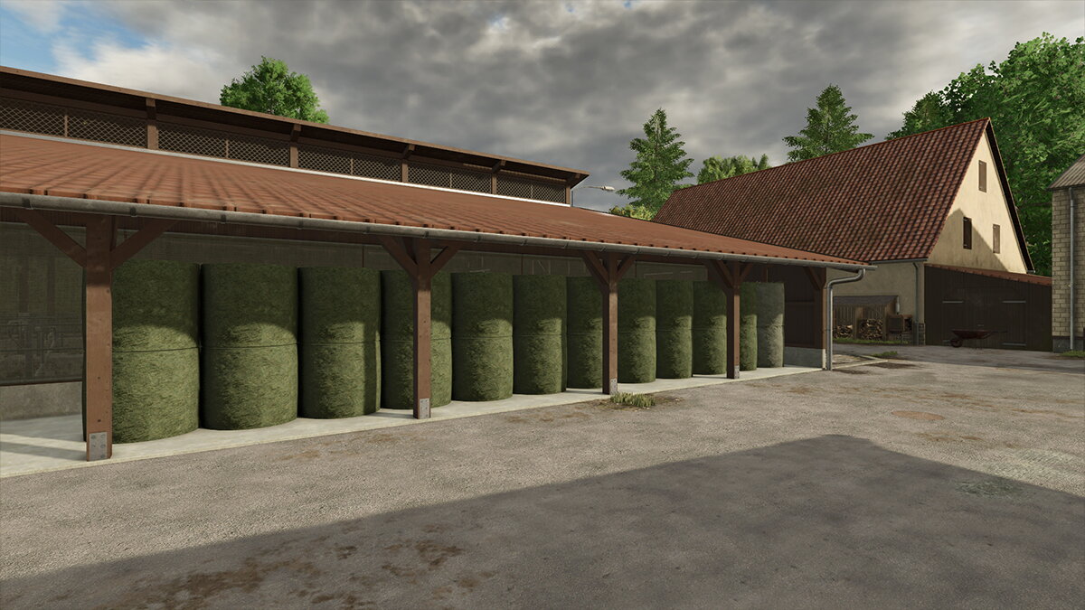 Hier entsteht gerade eine wirklich schöne Map nach realistischer Vorlage, auf der ich einen Hof beisteuern darf. Das Gelände ist herausfordernd, die Zufahrt interessant und der Aufbau über zwei Ebenen sorgt für Abwechslung im Spiel. Ein automatisches Ballenlager erleichtert die Arbeit und schont die Performance, während Hofladen und Gewächshaus zusätzliche Aufgaben auf dem Hof bieten. Der Hof ist kompakt gehalten und optimal für Maschinen im Bereich von 120–200 PS.