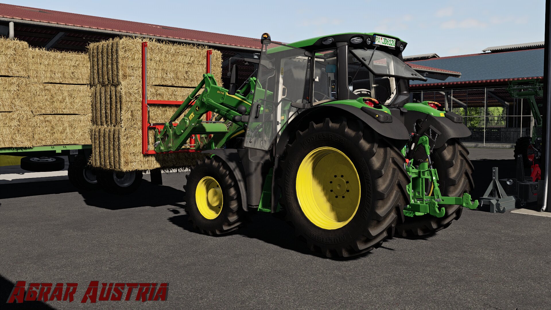 Die Ballen wurden dan mit dem JD 6120M vom Feld abgeräumt und direkt ins trockene gefahren.
