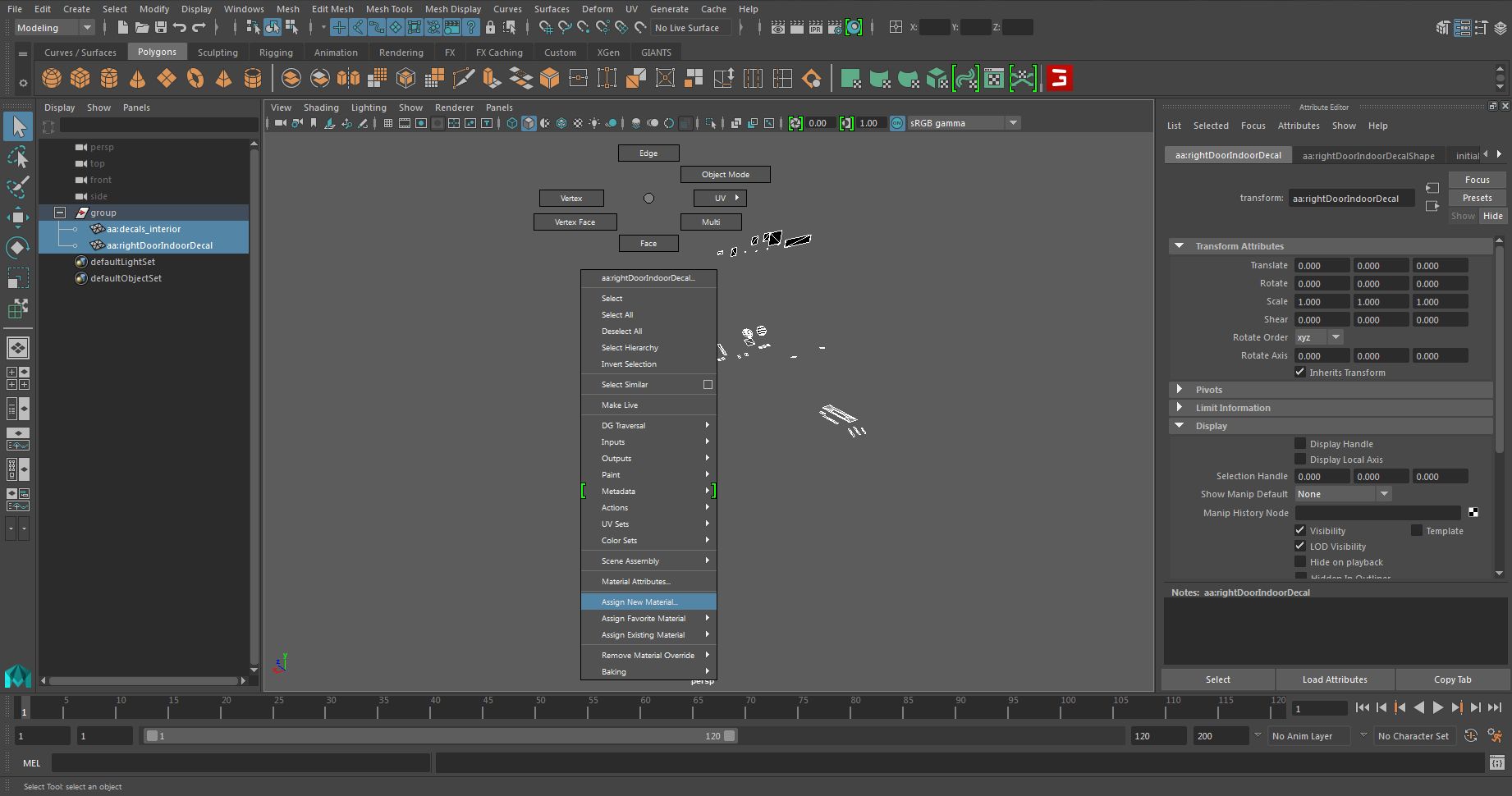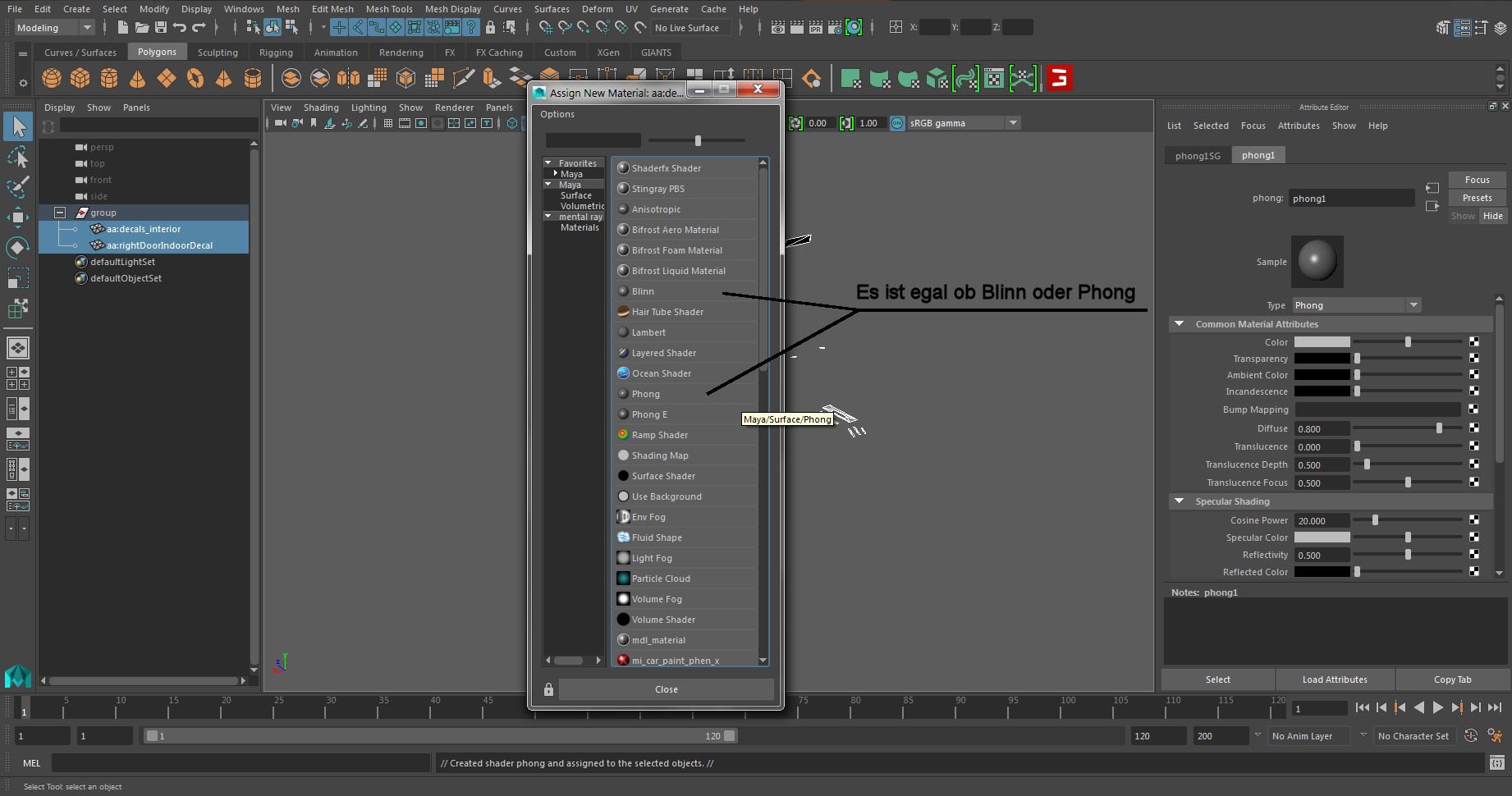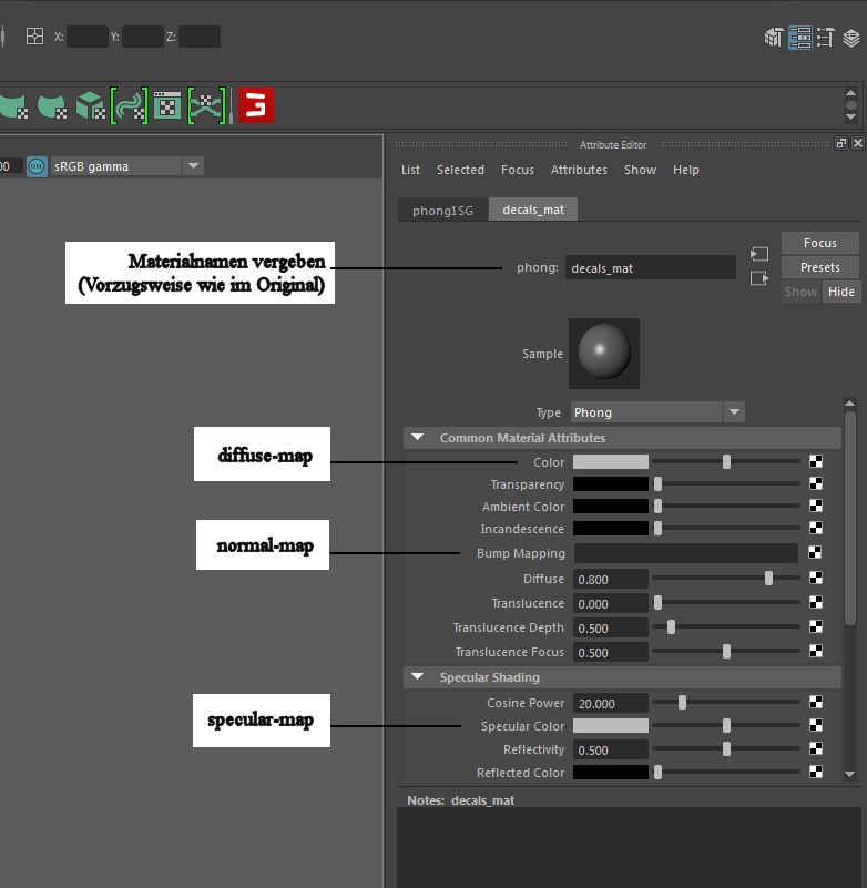 aa:decals_interior | phong1SG | file4 → Meshname | Material | TexturfileIst alles richtig gemacht, sollten wir nun die Specular sehen können.