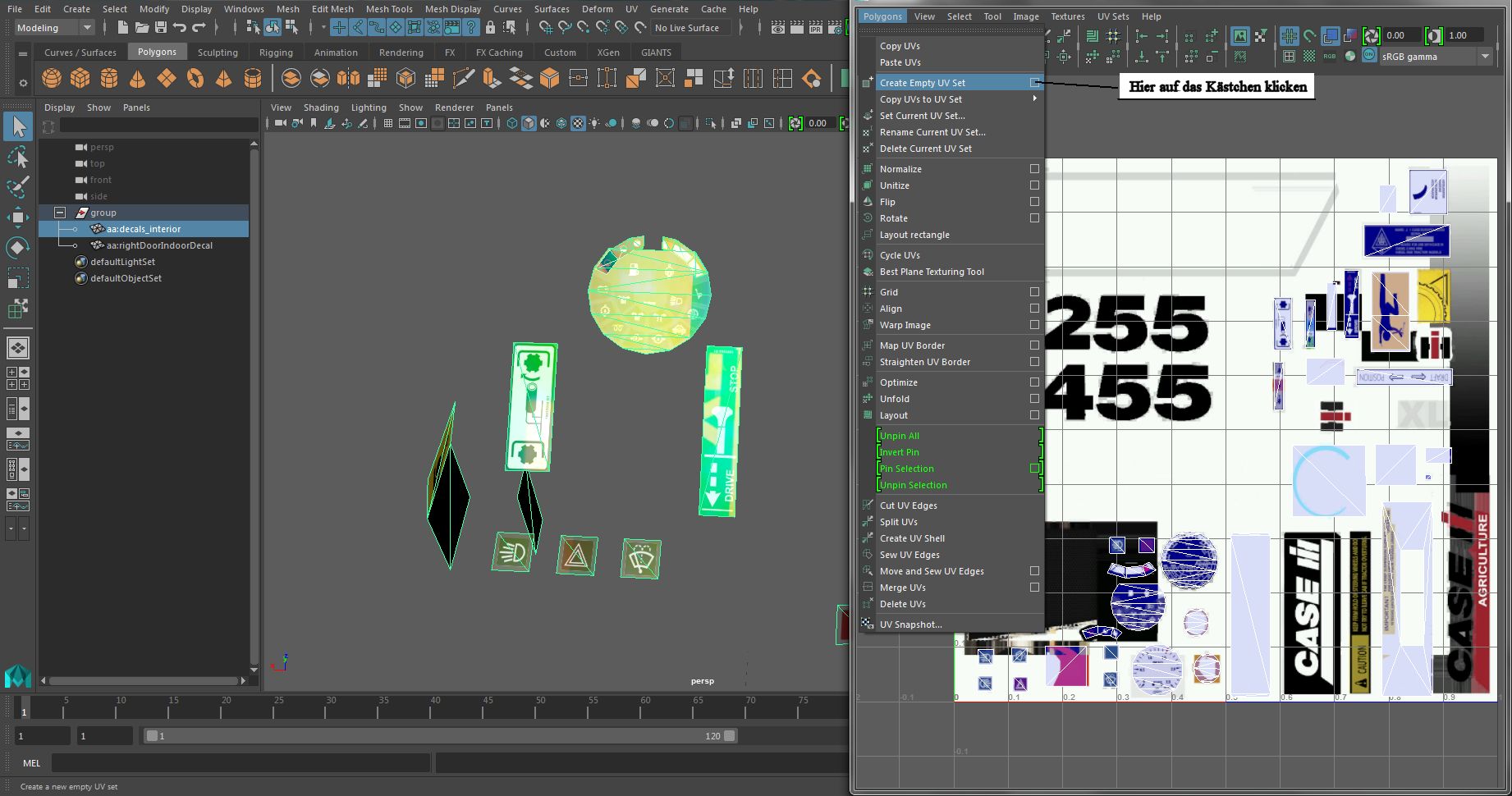 Dazu markieren wir wieder unsere Meshes, gehen auf Polygons → Create Empty UV Set und dort auf das kleine Kästchen.