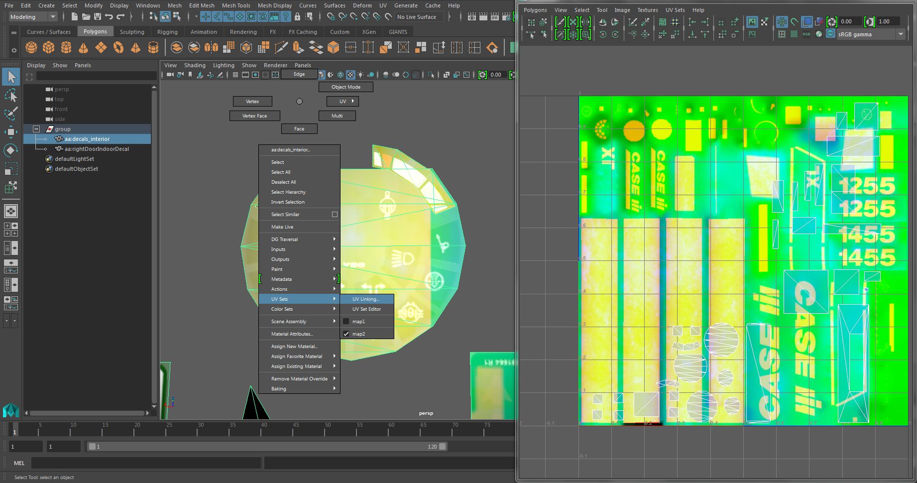 Damit auch wirklich nur die „map2“ des UV Sets bearbeitet wird, überprüfen wir dies indem wir oben auf UV Sets gehen und dann „map2“ auswählen.Nächster Schritt ist, das wir dem Mesh sagen müssen, welche Texturen zu welcher UV gehören.