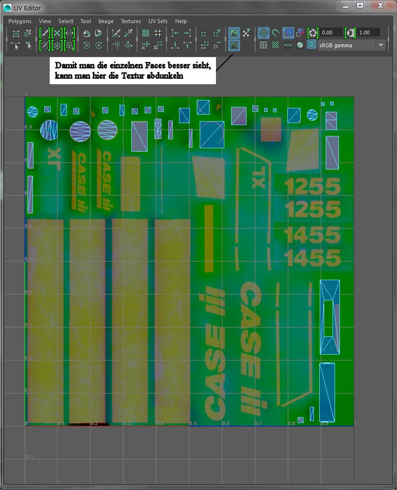 Habt ihr das geschafft, geht der Rest wie von alleine! ;DDamit ihr euch ein bisschen leichter tut die einzelnen Faces zu erkennen, könnt ihr im UV Editor die Textur abdunkeln.
