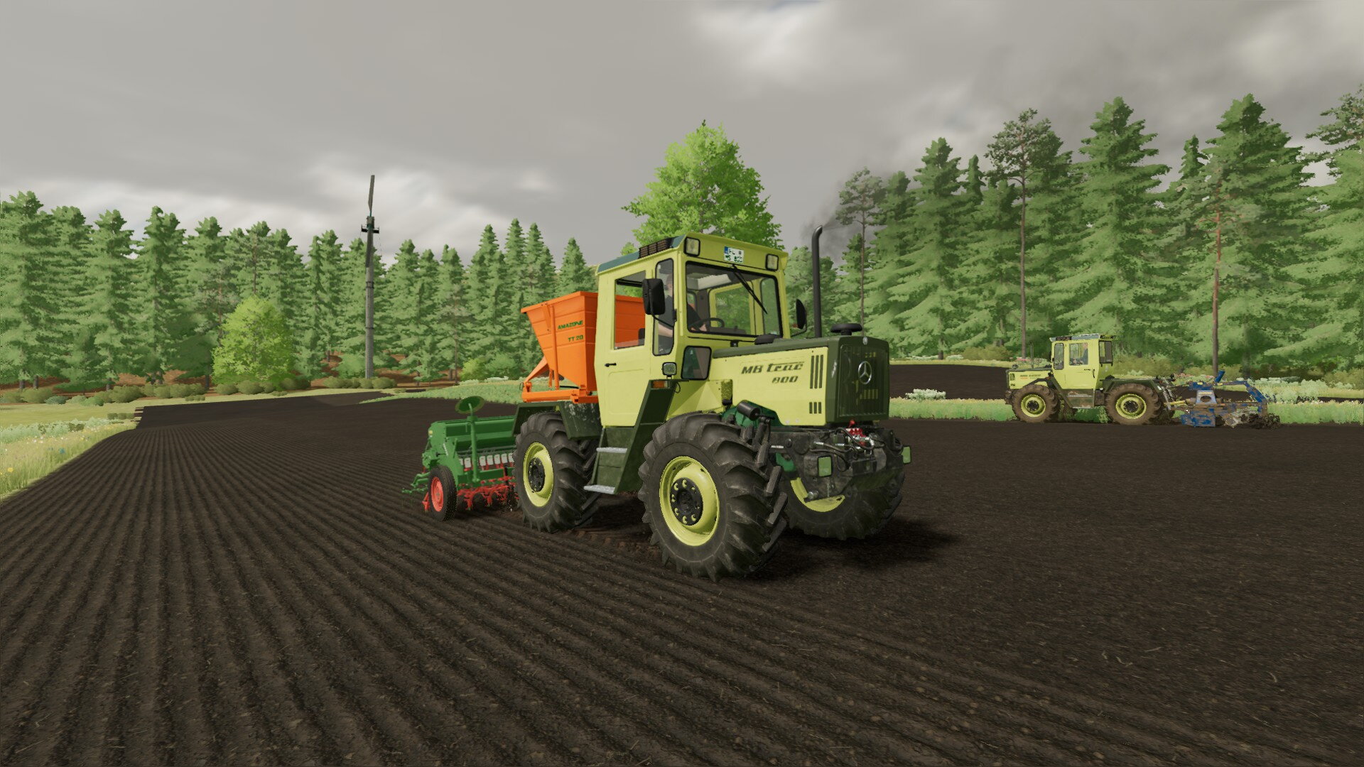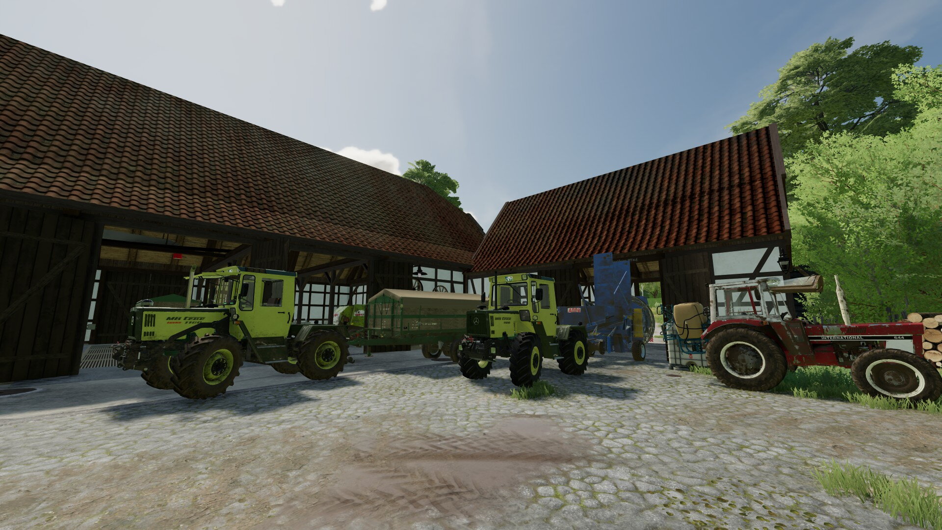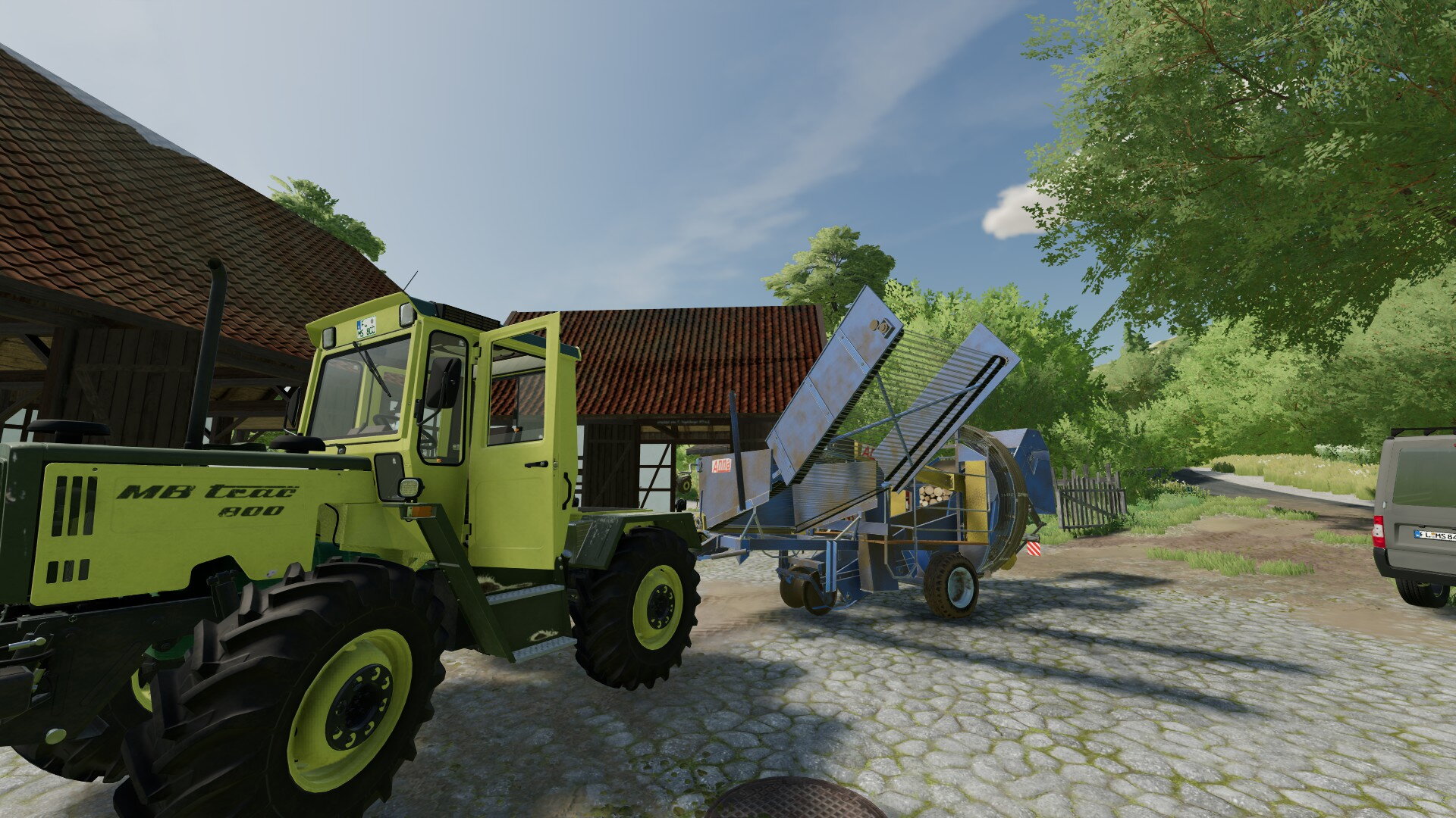 Ja, und ich sprach von Neuerungen. Eine davon habt ihr sicher schon entdeckt. Richtig, es gibt einen weiteren MB-Trac auf dem Hof. Wir haben relativ günstig einen 800er von 1987 schießen können. Er hat zwar schon 6.500 Betriebsstunden, stand aber sonst technisch gut da. Bei der Menge an Fahrten, die wir durch den Ackerbau haben, müssen wir sehen, dass wir robuste und zugkräftige Maschinen auf dem Hof haben. Und da passt der 800er einfach super.