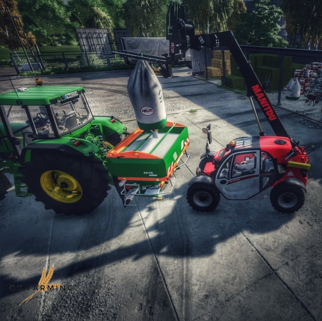 Mit am Platz des Landmaschinenhändlers Luca Motors ansässig ist ein Händler für landwirtschaftliche Produkte. Dort entlud ein freundlicher Mitarbeiter den Kalk aus den Bigbags mittels des Teleskopladers MLT 725-75H von Manitou in den ZA TS Streuer von Amazone. -