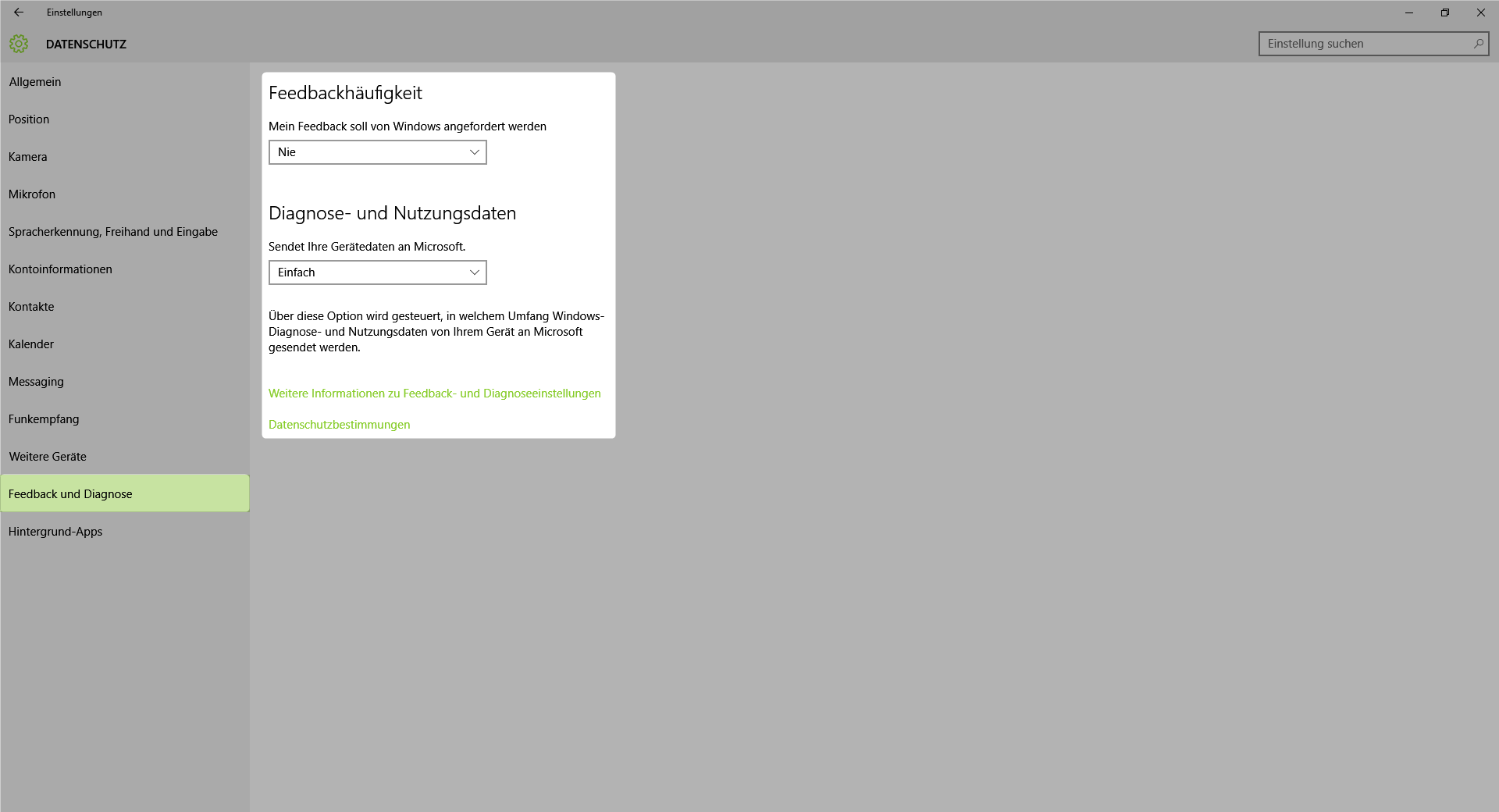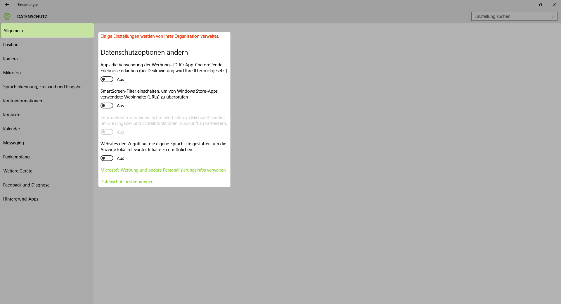 Besonders interessant finde ich den dritten Punkt im Reiter Allgemein (welcher sich nach der Einschränkung der Diagnose- und Nutzungsdaten automatisch deaktiviert); Stichwort Keylogger?!