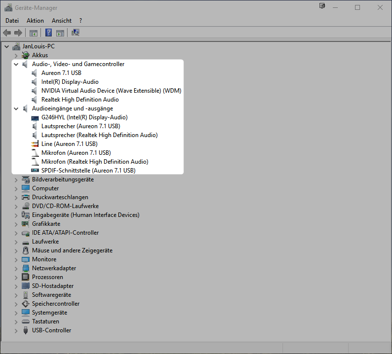 Sofern im Reiter Audio-, Video- und Gamecontroller mehrere Geräte erscheinen sollten, kannst du zusätzlich über den darauf folgenden Punkt Audioeingänge feststellen, von welchen Geräten dann auch Sound abgespielt wird.
