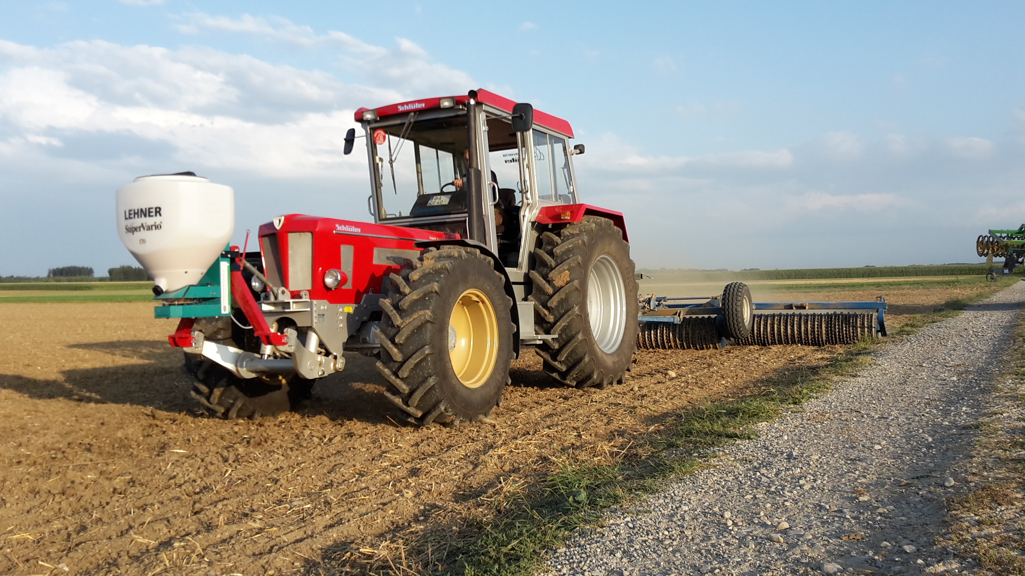 Schlüter Super 1250 VL mit Lehner Streuer und Rabe Walze