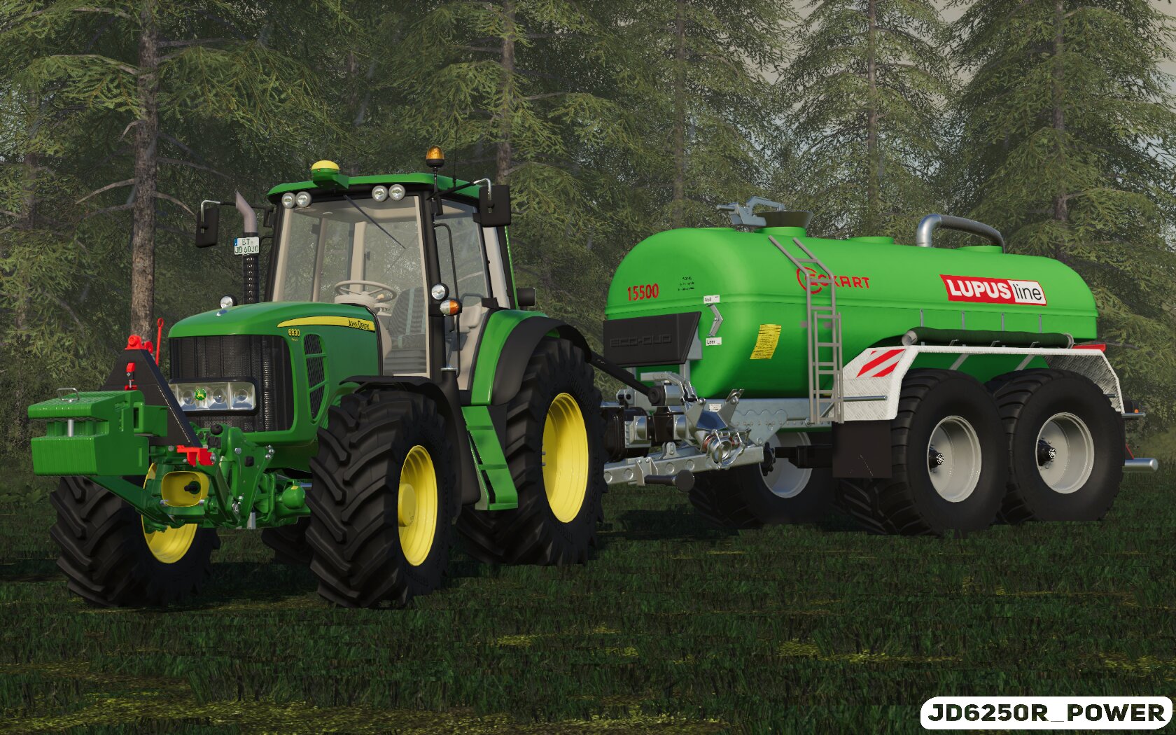 Die Gülle kommt auf Wiesen und aufs Weidelgras. Gefahren wird mit zwei Gespannen, hier das kleinere der beiden: mein John Deere 6830 Premium mit Eckart Lupus 155. In der Front hängt noch ein Frontgewicht mit ca. 700 kg.