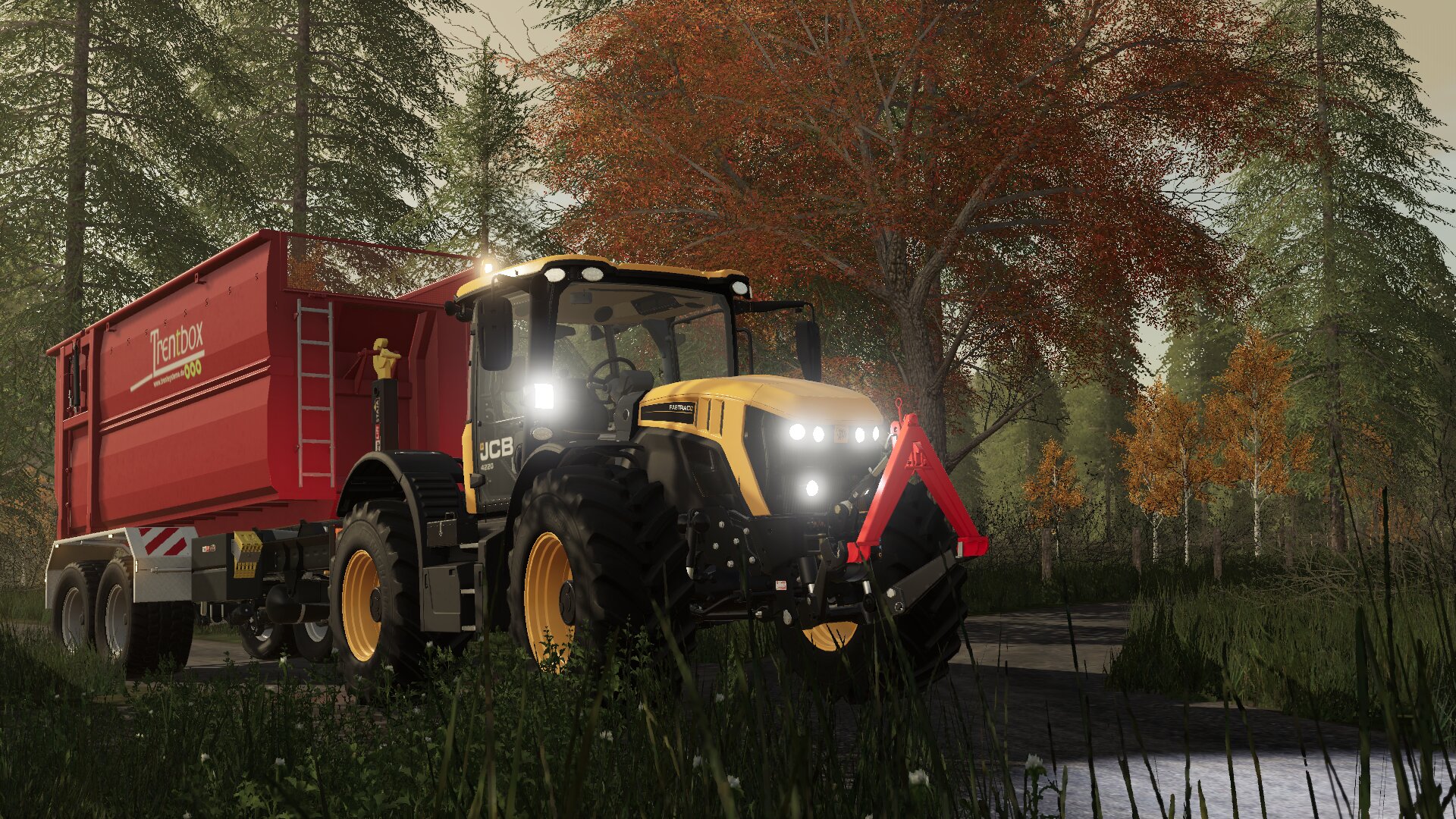 Hackschnitzel fahren mit einem JCB Fasttrac 4220 durch den herbstlichen Wald in Geiselsberg