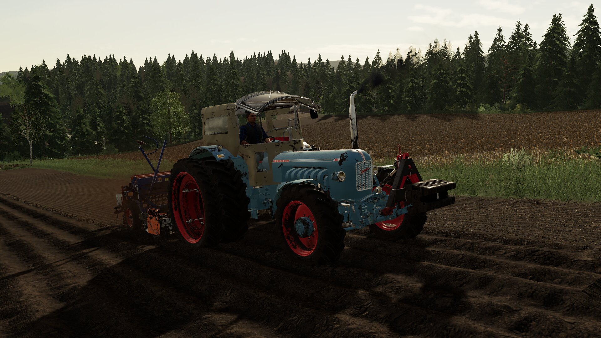 Der Eicher wurde zum sähen der Nassen und steilen Flächen vor die Sähmaschine gespannt und mit Doppelreifen ausgerüstet da der Eicher mehr Leistung als der IHC hat..