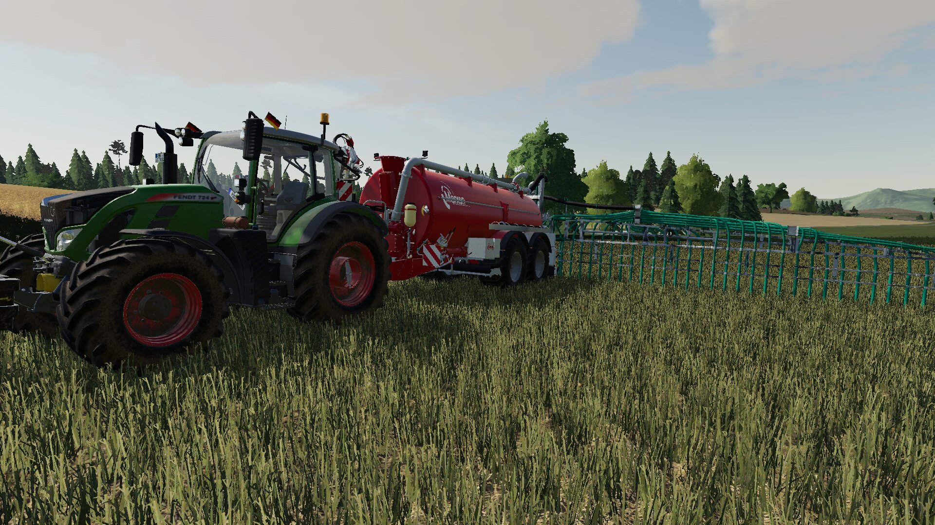 Heute würde die Gülle mit dem neuen Fass ausgebracht. Hier zusehen ein Fendt 724 Vario mit einem Marxen ST220 auf einem abgeernteten Rapsfeld.