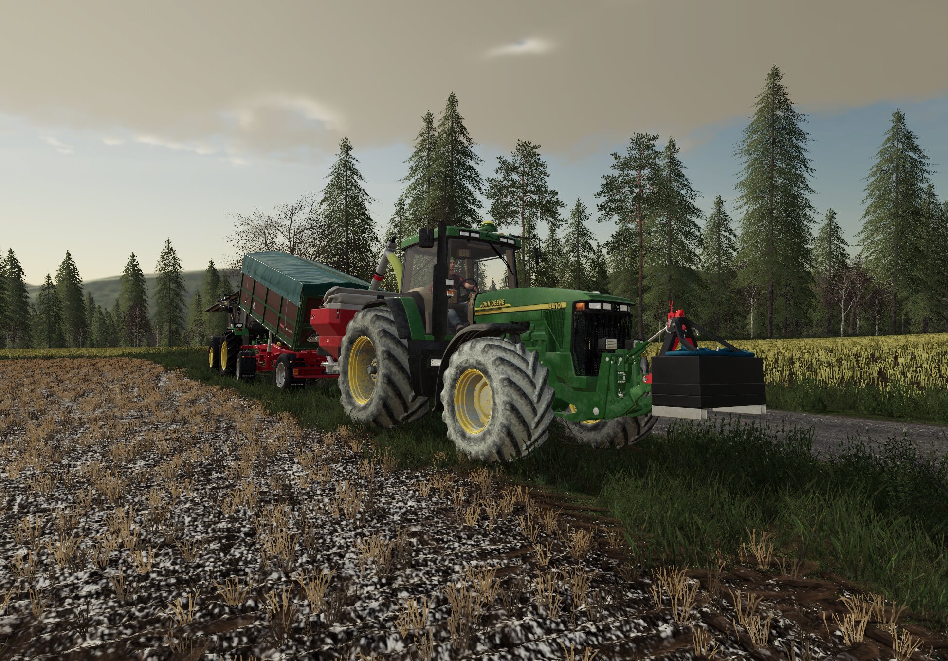 John Deere 8410 am Kalk streuen mit Rauch Streuer..