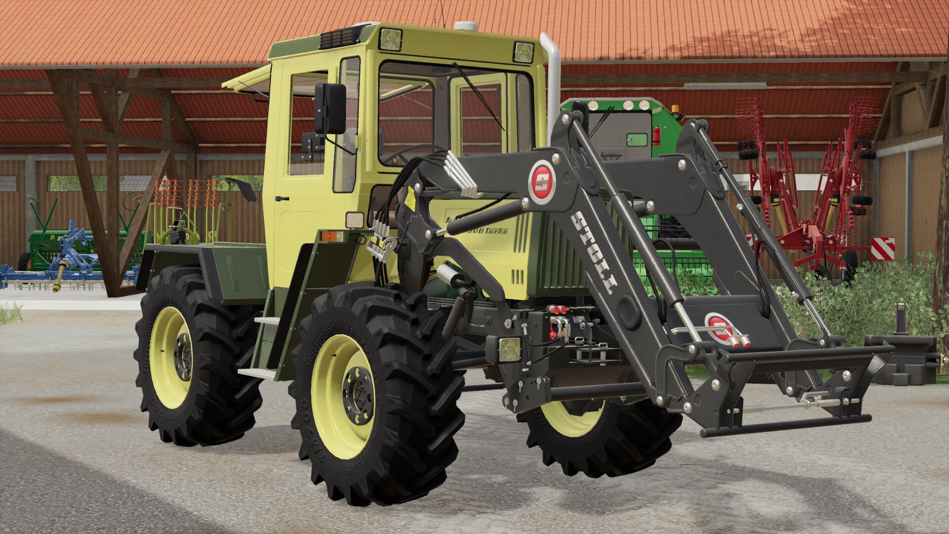 MB trac 900 Turbo mit EHR 4, Rockinger Anhängeschlitten, 3 DW Steuergeräte hinten, vorne und hinten je 2 zusätzliche LED Scheinwerfer, 26 Zoll Reifen, Kotflügelverbreiterung, Müller Track Guide 4 und Stoll FZ 30 mit Hydrofix Schnellwechsler.