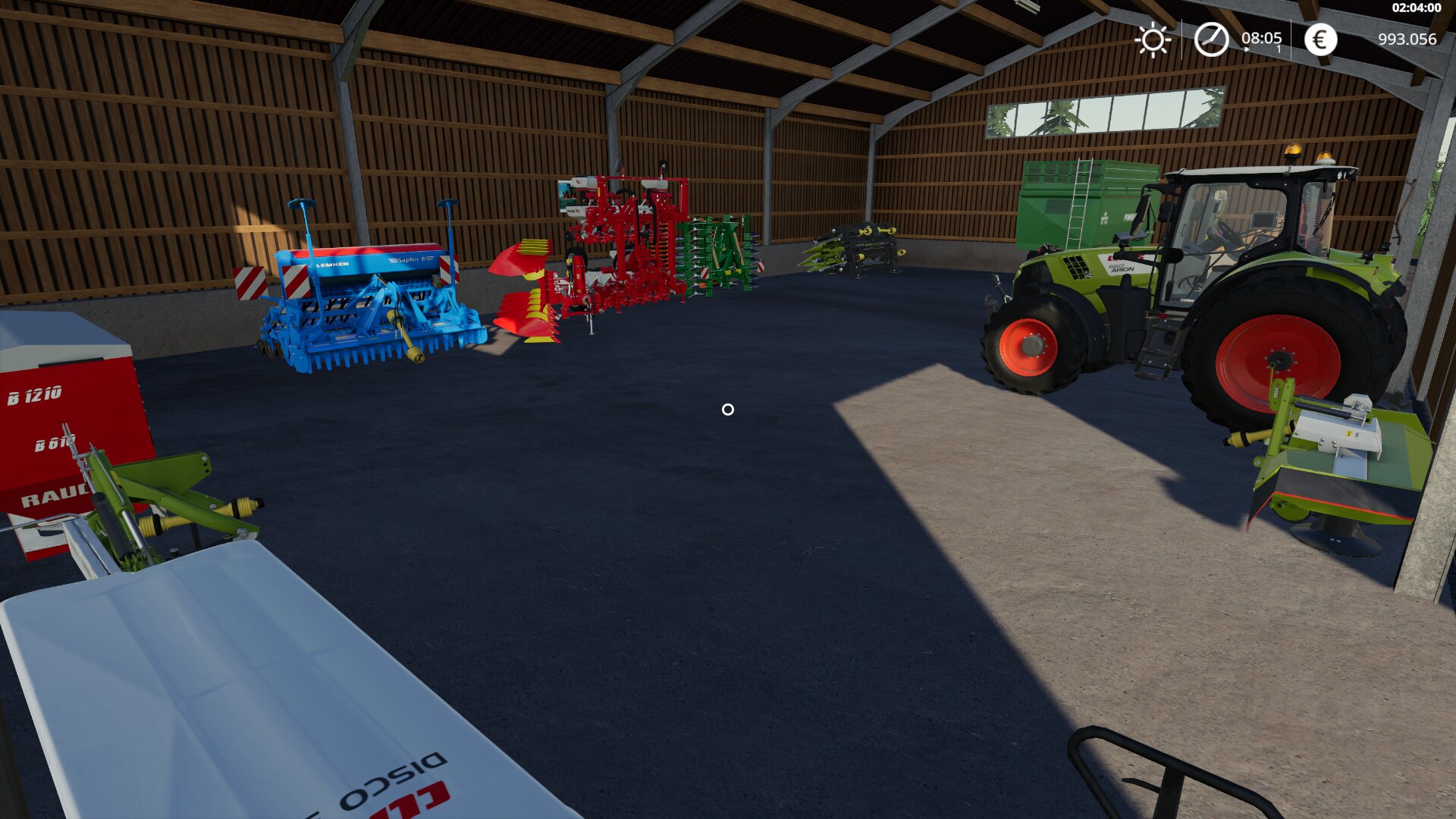 Wir befinden uns hier in der großen Halle wo ein großteil aller Maschinen stehen zum einen der dritte und letzte Schlepper und der zweite Kipper sowie unsre beiden Mähwerke der Düngerstreuer und die beiden Sähmaschinen für Getreide und Einzelkorn der Pflug die scheibenegge und der Maispflücker für denn Mähdrescher sind hier untergebracht