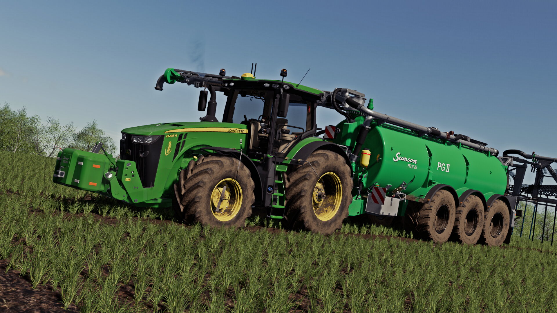 John Deere 8295R mit Samson PG 28 wartet auf Nachschub.