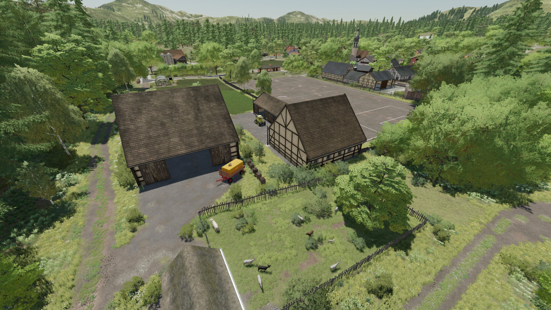 Dieses Gebäudepack von Bernie passt nahezu perfekt zum Dorfhof, und mit "Überall Malen Und Gelände Verändern" von modelleicher pflegt sich das rein über das Ingame-Baumenü auch alles relativ leicht ein, inkl. der Wegeführung.