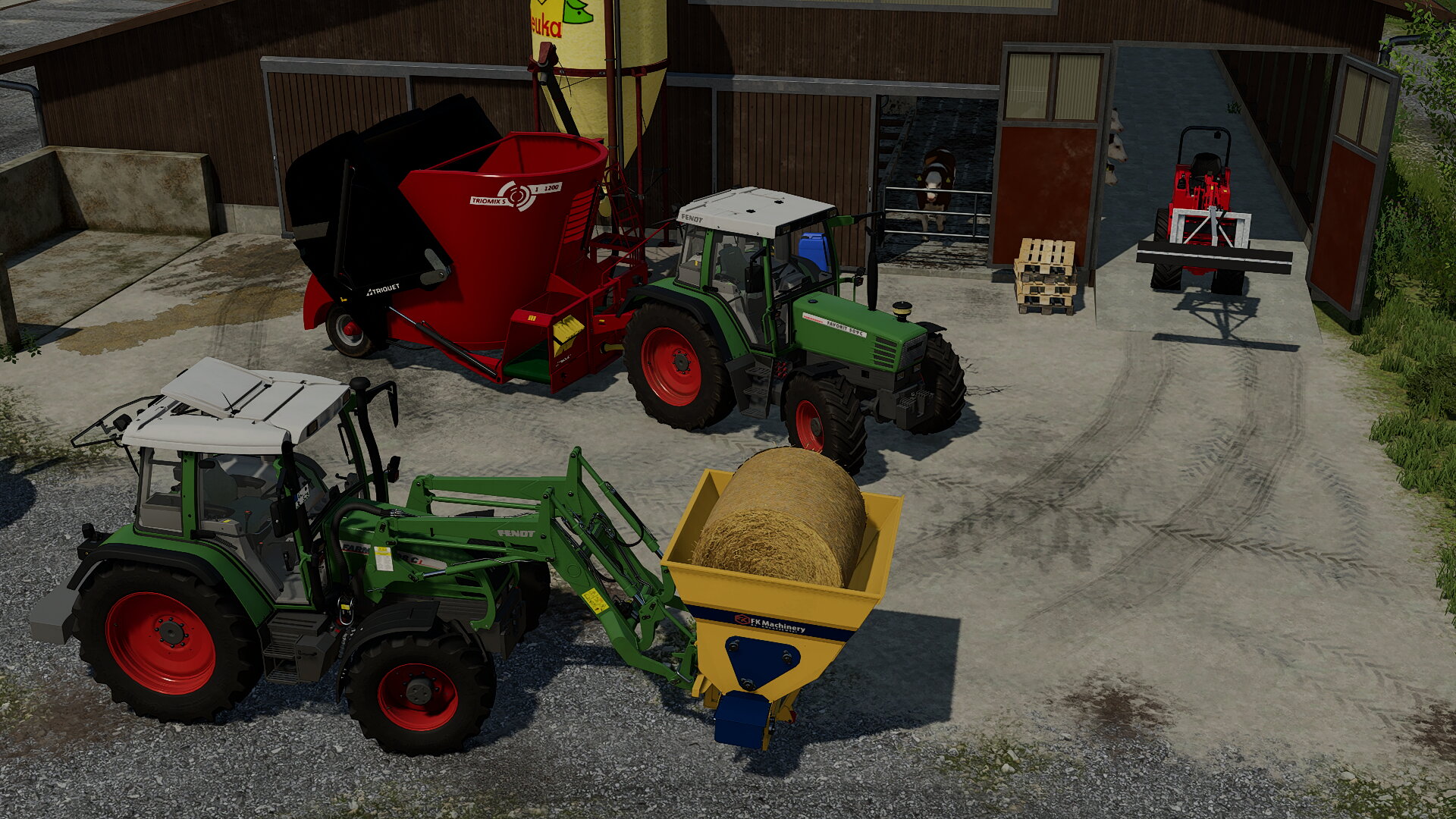 Die 40 Milchkühe mit dem Fendt 509C füttern. Eingestreut wird mit dem 308Ci