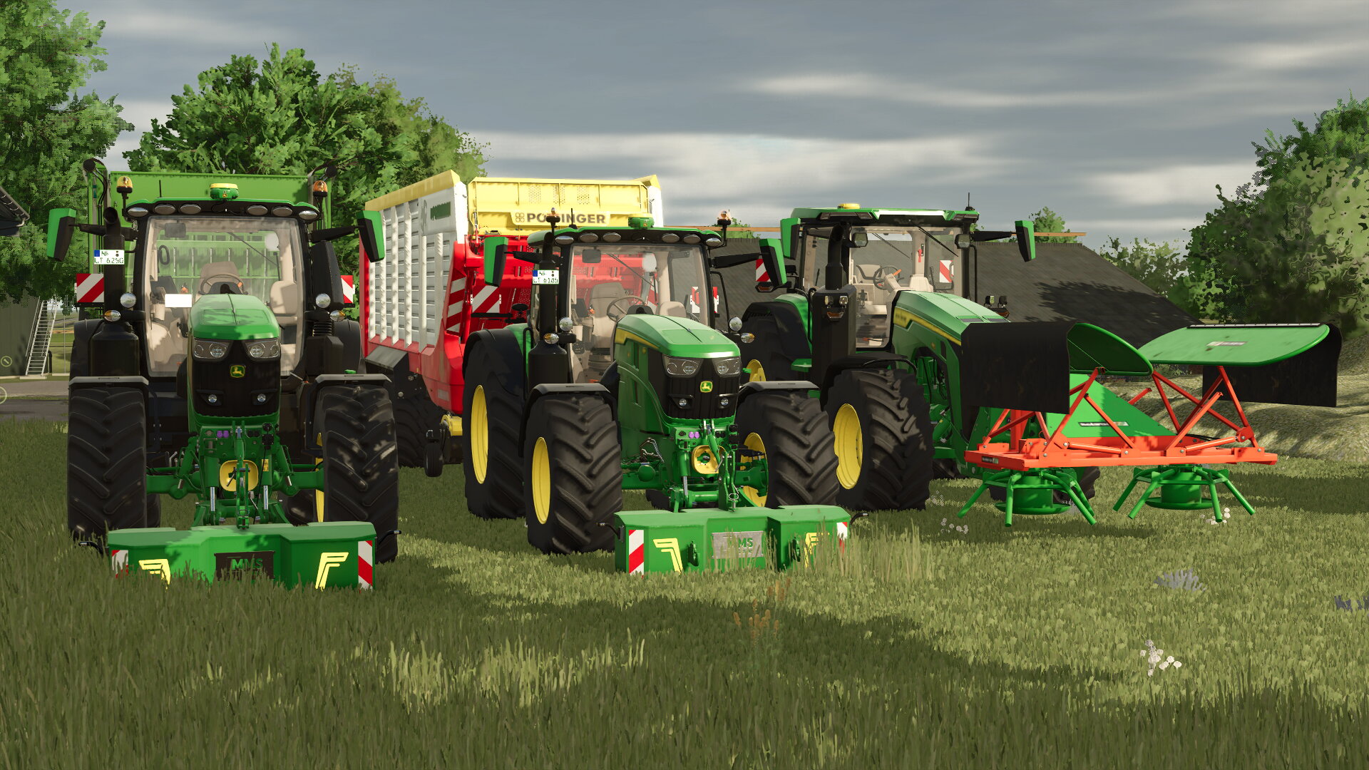 Die Erntekolonne hat für heute Feierabend. Hier stehen unser 6R 250 mit Shuttle 490S, unser 6R 185 mit Pöttinger Jumbo 8450 vom Nachbarn und unser 8R 370 mit Verteiler
