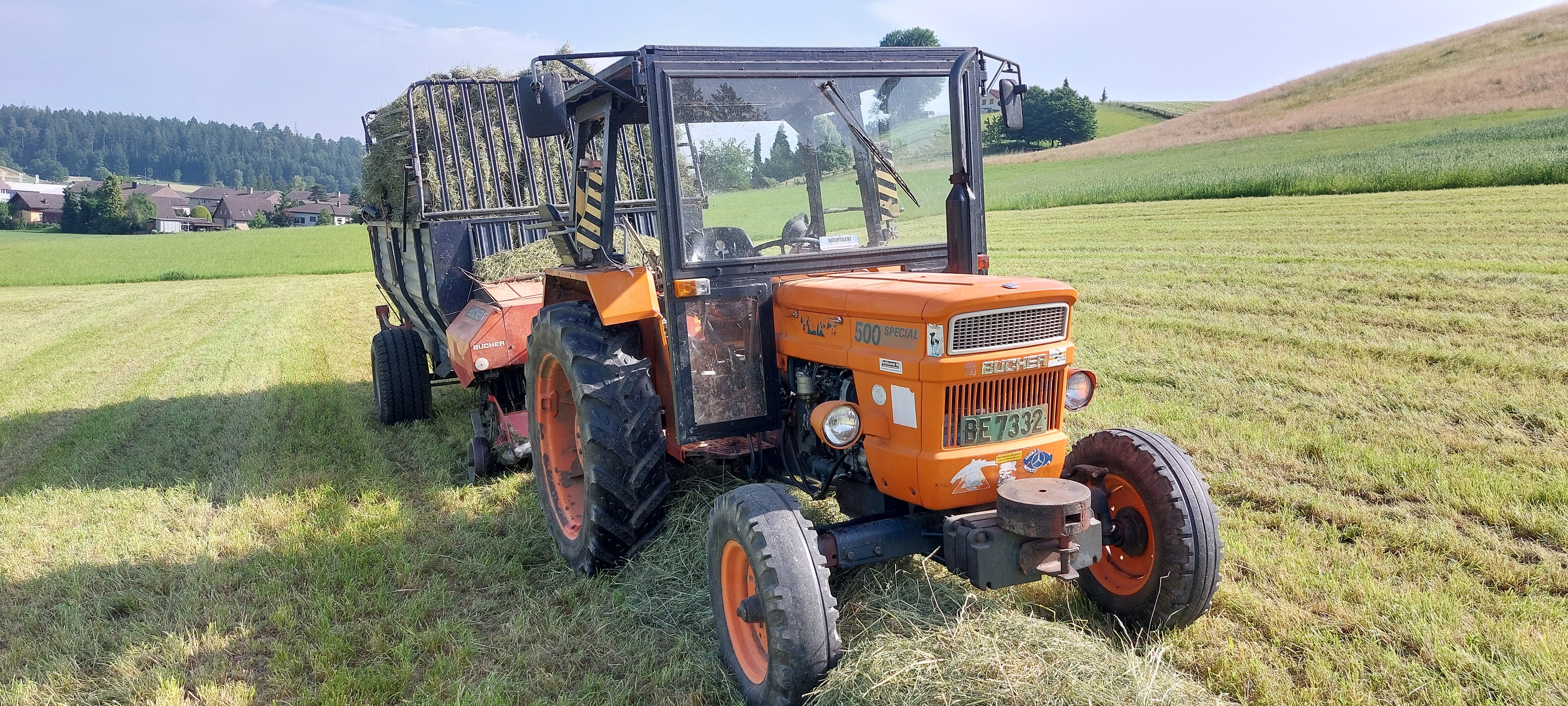 Der gute Fiat 500 Spezial (Jg. 1974, 11916 std) und dem Bucher Uni T24K Ladewagen (Jg. 1989)