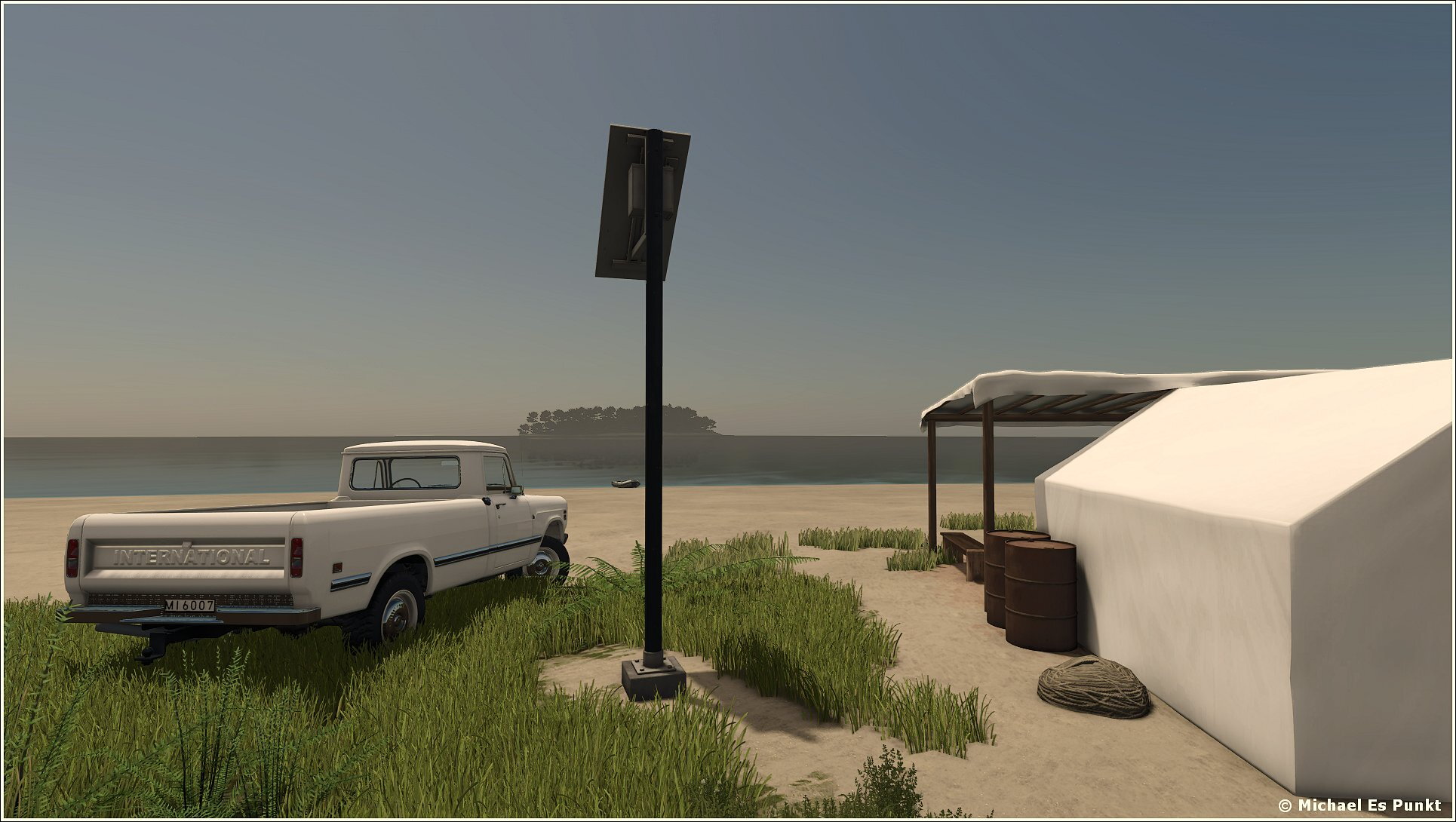 Nach einiger Zeit hatte er sich nicht nur ein recht geräumiges Zelt aufgestellt, nebst allerlei Zubehör und einer Einrichtung, er hatte sich auch ein ein Schlauchboot aufgeblasen und einen vorhandenen Brunnen nebst Solaranlage in Betrieb genommen. Hier würde er es eine Weile aushalten können.