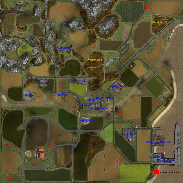 Kurzer Überblick für alle, die die Map nicht kennen:Auf der Map findet man jegliche Art von Terrain, von bergig bis Flachland ist alles dabei. Die Ortsnamen sind aus dem Berliner Raum entliehen, die Map an sich ist aber nach keinem realen Vorbild gebaut.Fruchtarten: Weizen, Gerste, Raps, Mais, Kartoffeln, Rüben, Klee, LuzerneTiere: Schafe, Kühe, Hühner, SchweineFelder: 44 von 1.15 bis 10.17 ha, diverse Grasflächen.Zwei nutzbare Höfe und ein Lohnunternehmen.-> Erster Hof im Gebirge mit Fokus auf Milchwirtschaft-> Zweiter Hof im Flachland mit Fokus auf Viehzucht und Ackerbau-> Lohnunternehmen für Freunde von GroßgerätExtras: