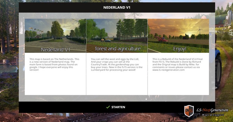 Here is the Nederland V1 this is a rebuild for Farming simulator 15 the map is orginal build for FS13 by Mike.
