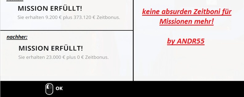 Durch diesen Mod werden die Zeitboni für Nachfragemissionen auf 0€ gesenkt, als Ausgleich wird die eigentliche Belohnung ver-2,5-facht.