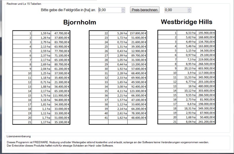 Mit dem Ls 2015 Feldpreis-Rechner kannst du die Preise von Feldern berechnen. Du gibst einfach die Fläche in [ha] ein und bekommst den Preis ausgegeben.