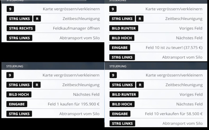 Bedienung (ähnlich dem Siloverkaufs-Mod): Aussteigen, recht STRG-Taste gedrückt halten. Feldauswahl mit Bild-Hoch und Bild-runter. Aktion durchführen dann mit ENTER.