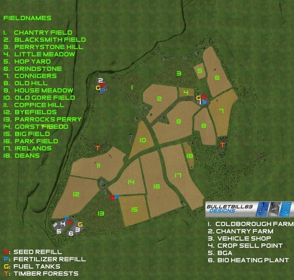 There are two farms. The first, Coldborough Farm is for arable farming, your Grain storage is located here. The second, Chantry Farm, is the livestock farm. There are bale/straw sell points at both farms. You have 18 fields to grow crops in, 2 Forests, and many grass fields. Seed and Fertilizer refill points are located through out the map.