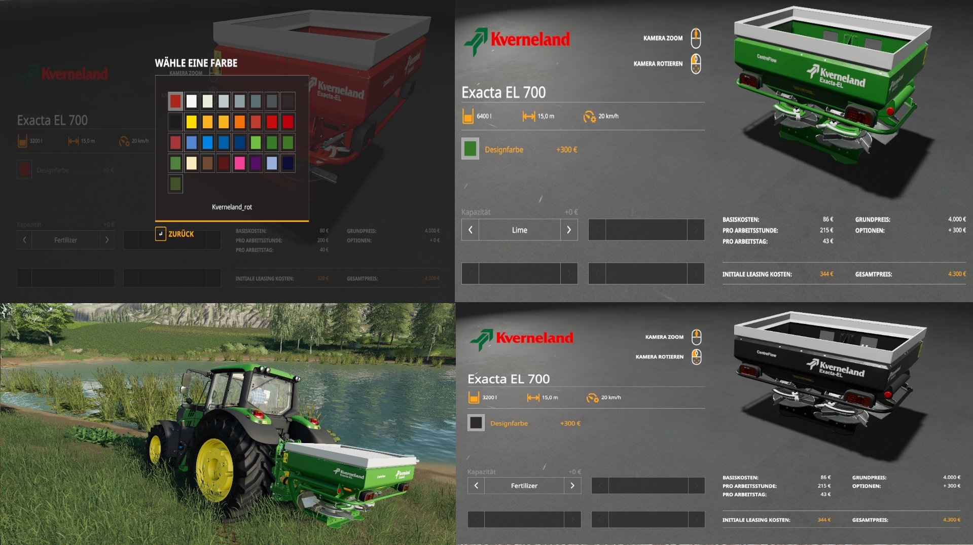 Habe die Kverneland Exacta EL 700 mal etwas umgebaut. Dazugekommen ist nun die Kalk Funktion mit einem Fassungsvermögen von 6400L, durch den hohen verbrauch. Es kann weiterhin auch die Dünge Funktion im Shop gewählt werden, diese ist mit 3200L auf dem Standard Volumen geblieben. Wenn man noch seinen Streuer in Traktor Farbe möchte kann dies auch durch die Farbauswahl im Shop umgesetzt werden.