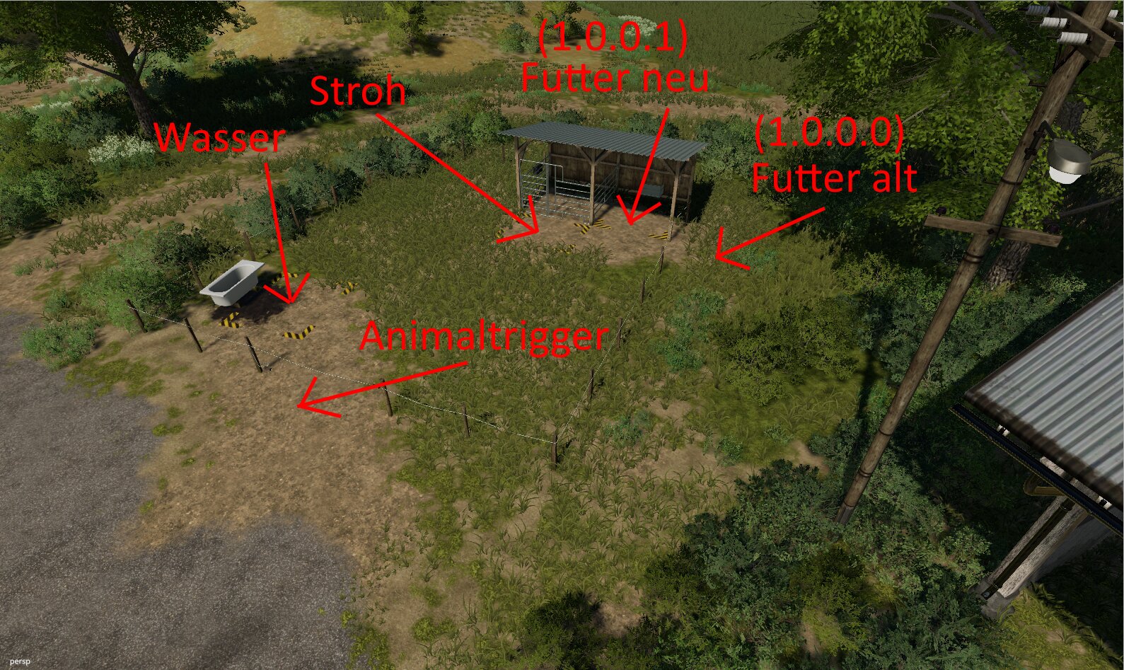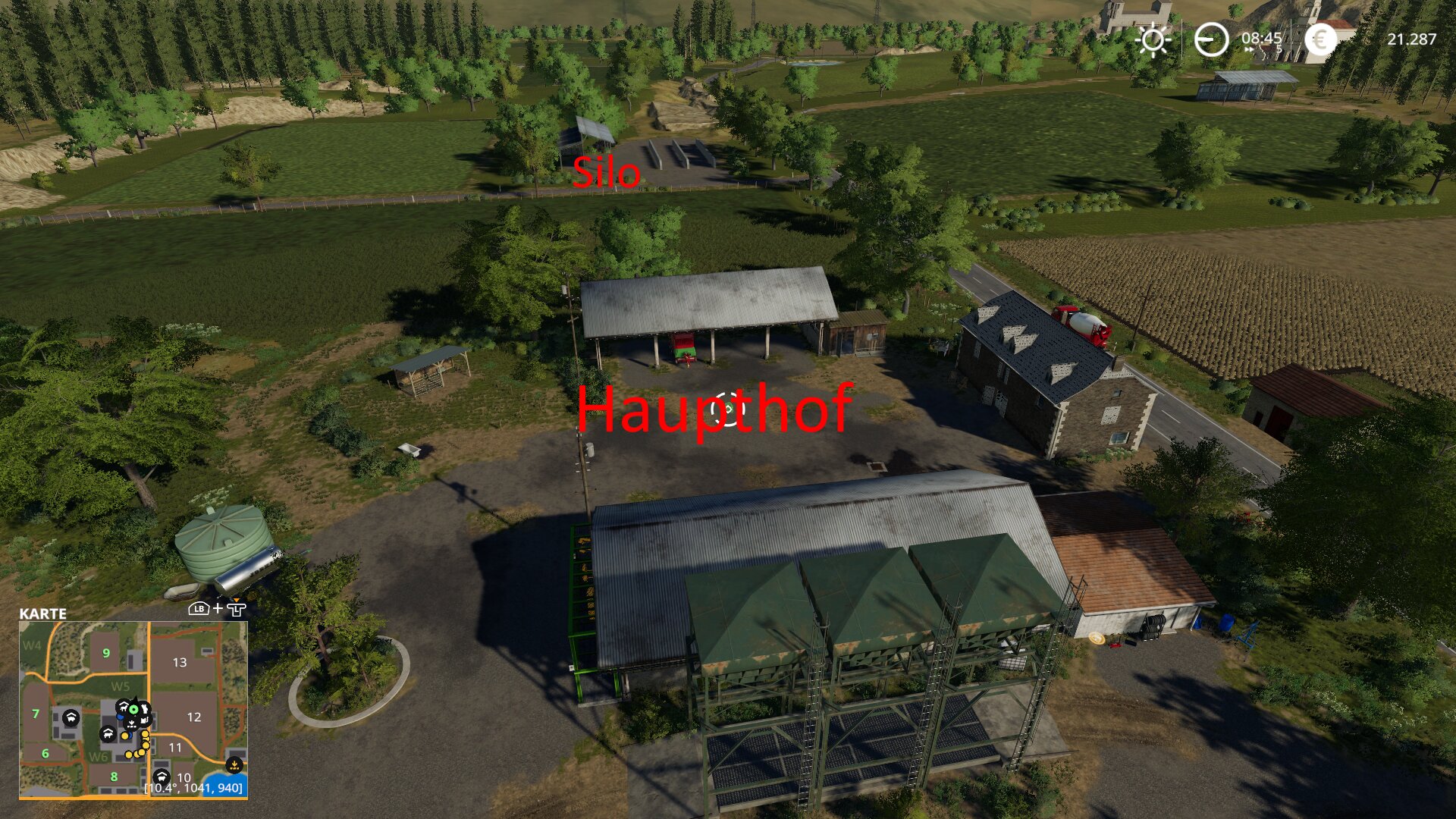 Am und um den Haupthof sind alle Tiere verbaut. Das Hofsilo ist multifunktional (keine Scheune erforderlich). Für ein platzierbares Silagesilo ist knapp oberhalb des Hofes ein Platz eingerichtet. An der BGA muss ein Silo platziert werden.