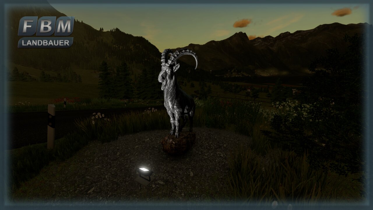 Eine frei platzierbare Steinbock Statue aus Metall auf Felsgestein mit Nachtbeleuchtung.