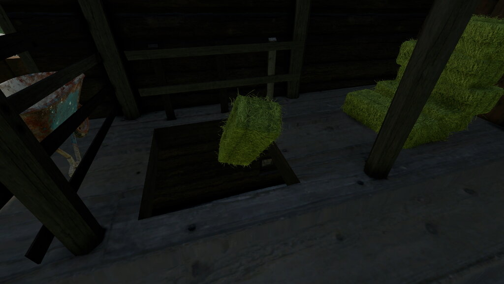 Im oberen Bereich des Gebäudes können Ballen gelagert werden. Durch eine kleine Luke im Boden können die HD-Ballen auch wieder nach unten geworfen werden, um dann dort Eingestreut oder verfüttert zu werden.