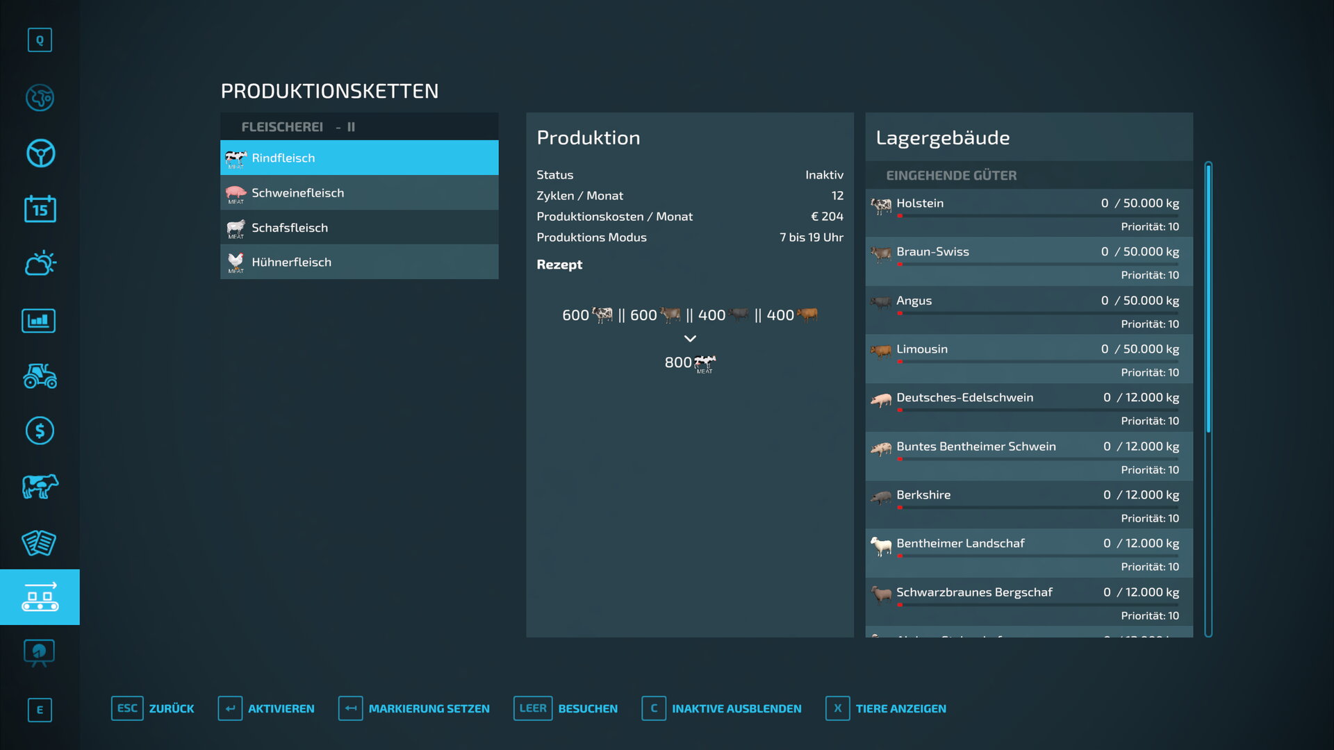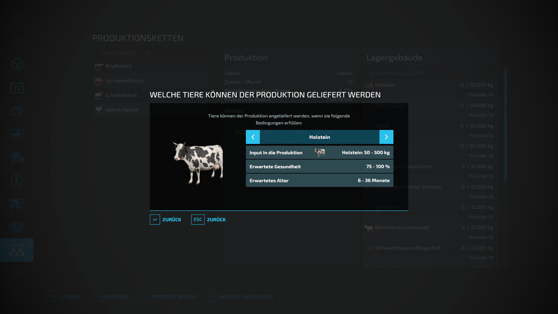 - Aufgrund der hohen Nachfrage, gibt es in der Version 1.0.0.5 nun die Möglichkeit, die Tiere ab dem 1. Monat in die Fleischerei zu liefern. Wer weiterhin ab dem 6. Monat die Fleischerei beliefern möchte, sollte nicht auf die 1.0.0.5 updaten