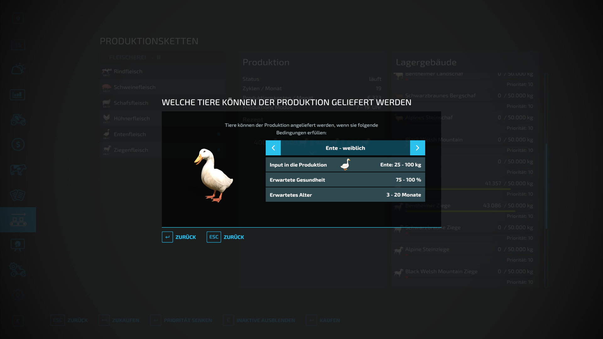 Kühe, Schweine, Schafe, Hühner, Enten, Ziegen und Pferde können nur verarbeitet werden, wenn diese eine Gesundheit über 75% besitzen.