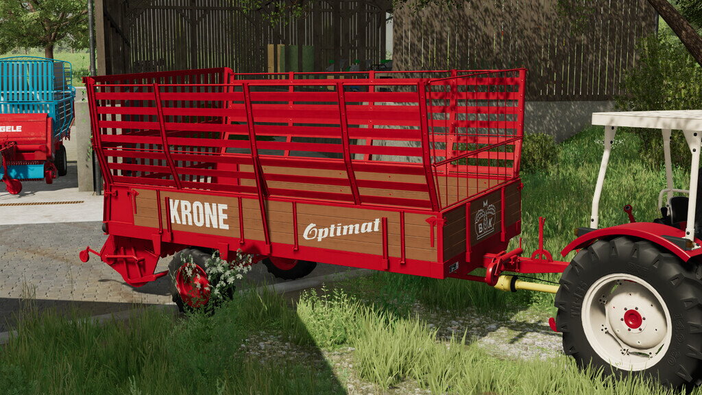 An den serienmäßigen Stalldungstreuer Krone Optimat, wurde an Stelle des Streuwerks, das Allesladeraggregat angebaut.